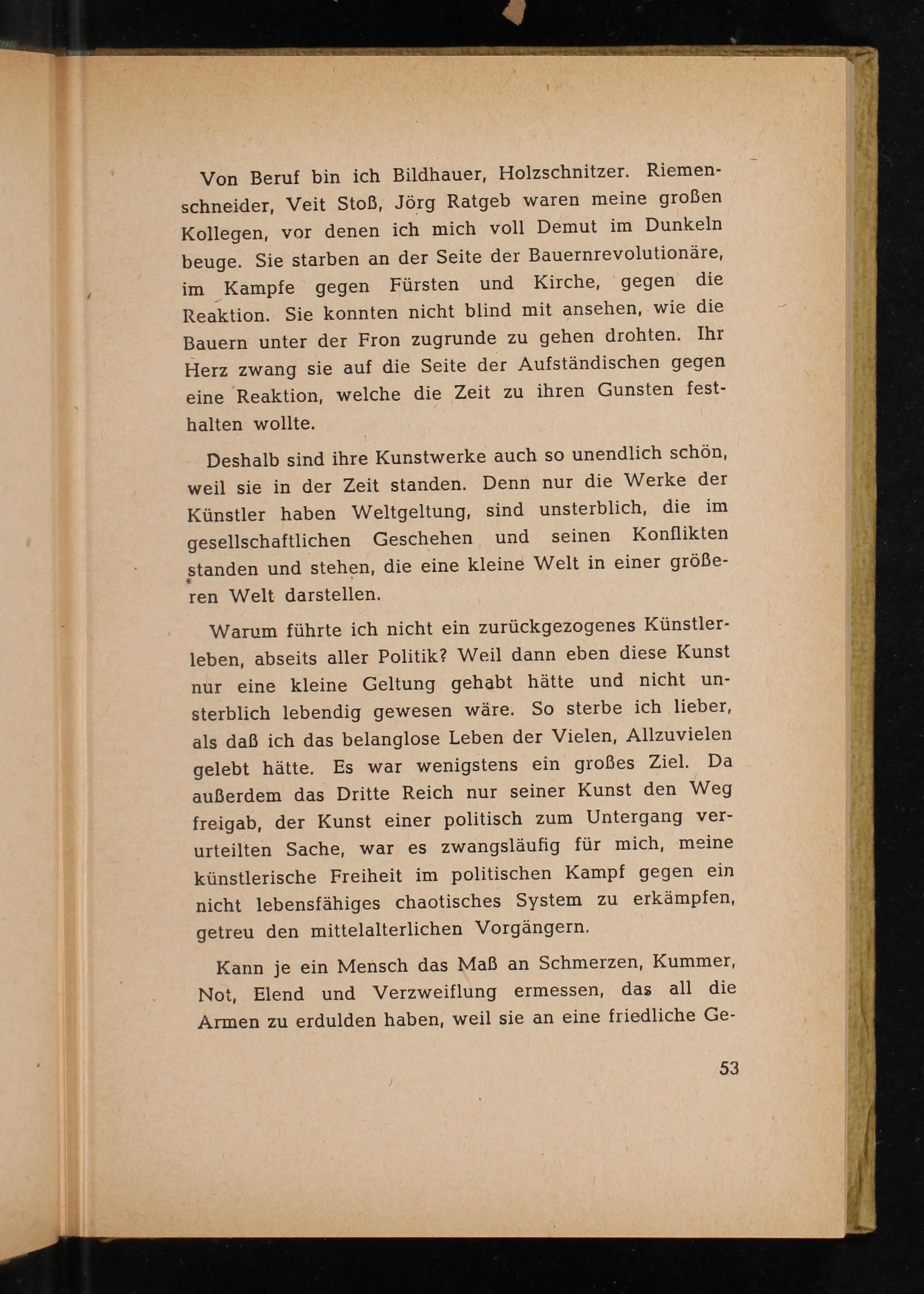 Von Beruf bin ich Bildhauer, Holzschnitzer. Riemenschneider, Veit Stoß, Jörg Ratgeb waren meine großen Kollegen, vor denen ich mich voll Demut im Dunkeln beuge. Sie starben an der Seite der Bauernrevolutionäre, im Kampfe gegen Fürsten und Kirche, gegen die Reaktion. Sie konnten nicht blind mit ansehen, wie die Bauern unter der Fron zugrunde zu gehen drohten. Ihr Herz zwang sie auf die Seite der Aufständischen gegen eine Reaktion, welche die Zeit zu ihren Gunsten festhalten wollte.