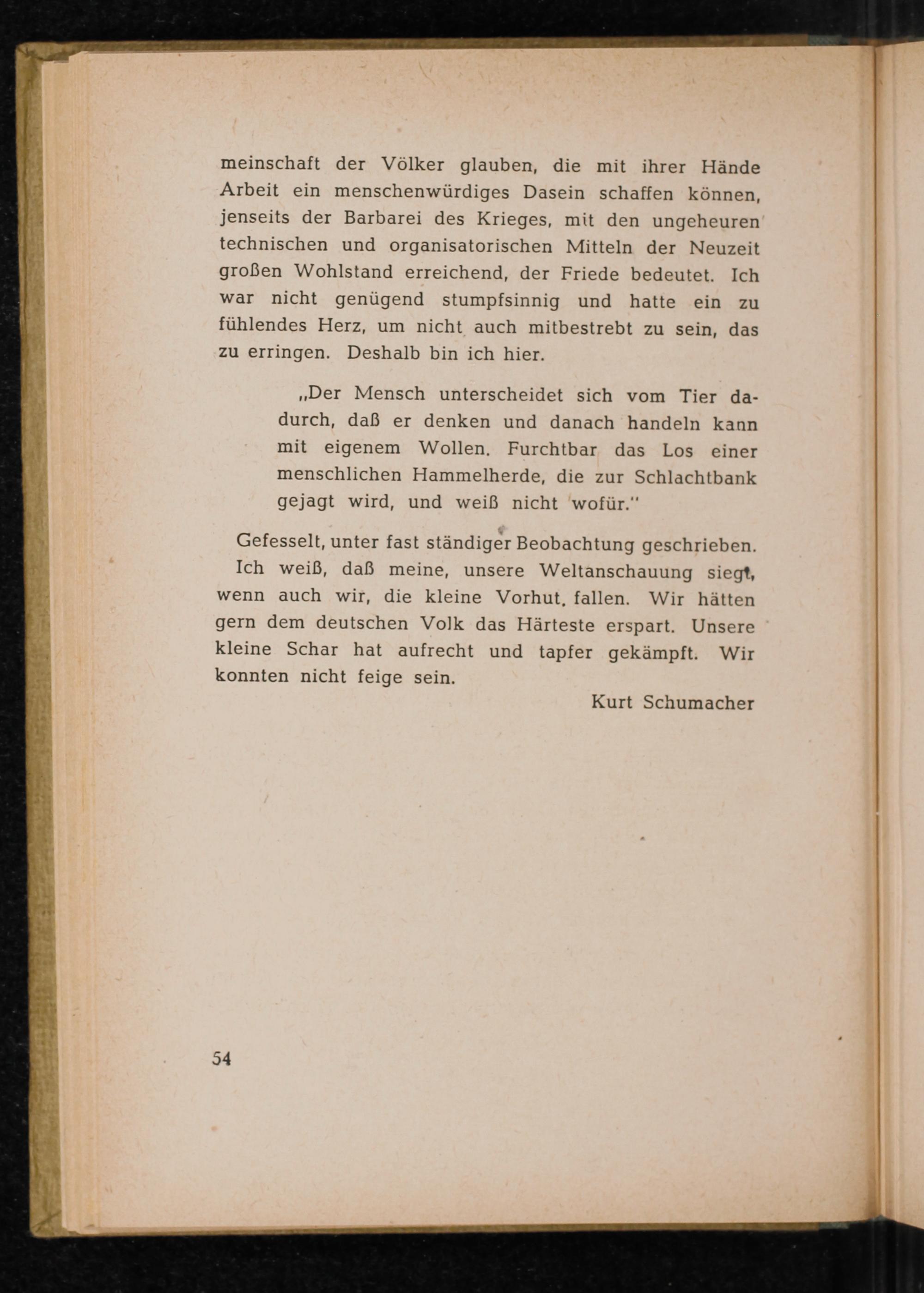 „Der Mensch unterscheidet sich vom Tier da- durch, daß er denken und danach handeln kann mit eigenem Wollen. Furchtbar das Los einer menschlichen Hammelherde, die zur Schlachtbank gejagt wird, und weiß nicht'wofür.”