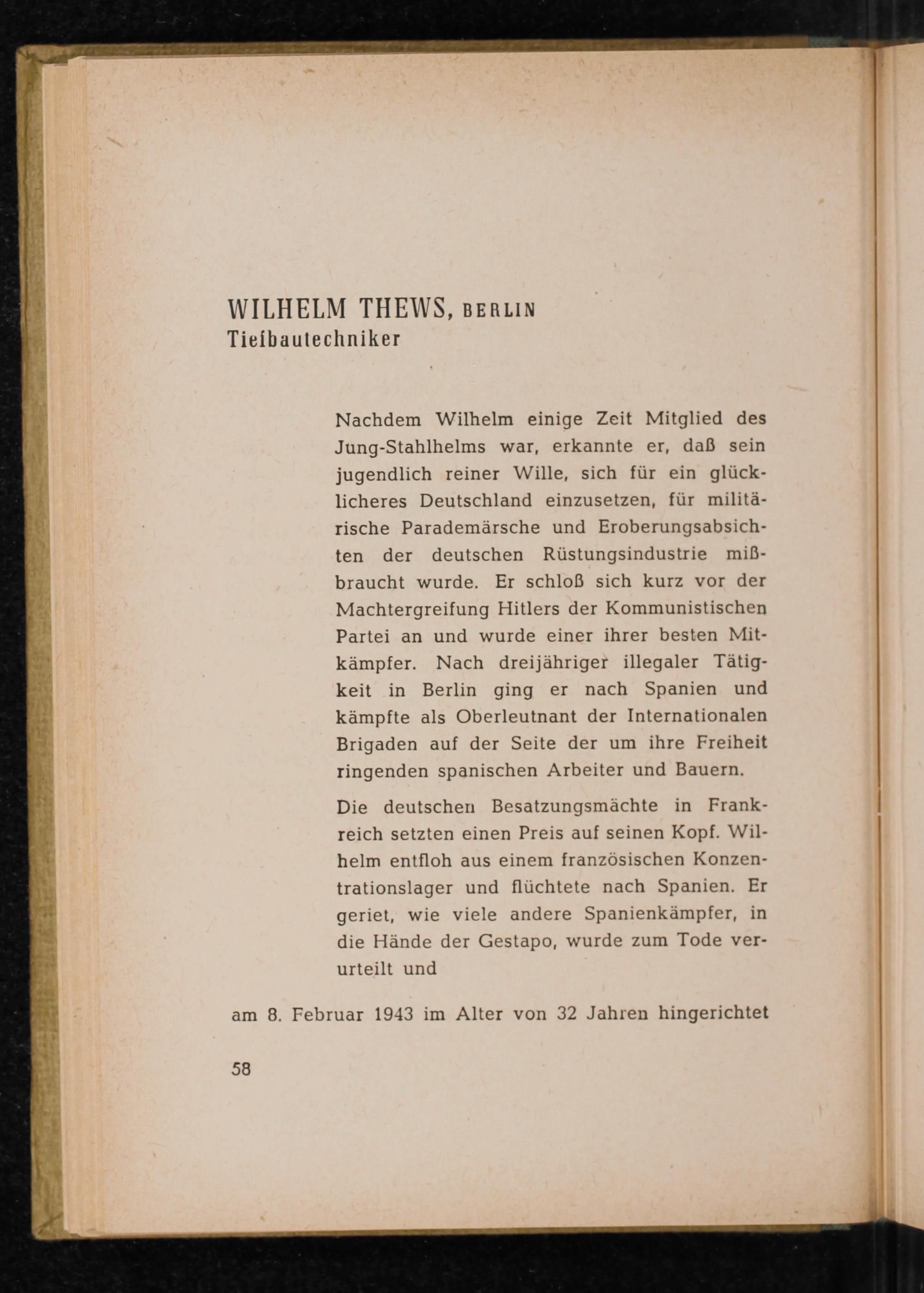 Nachdem Wilhelm einige Zeit Mitglied des Jung- Stahlhelms war, erkannte er, daß sein jugendlich reiner Wille, sich für ein glücklicheres Deutschland einzusetzen, für militärische Parademärsche und Eroberungsabsichten der deutschen Rüstungsindustrie miẞbraucht wurde. Er schloß sich kurz vor der Machtergreifung Hitlers der Kommunistischen Partei an und wurde einer ihrer besten Mitkämpfer. Nach dreijähriger illegaler Tätigkeit in Berlin ging er nach Spanien und kämpfte als Oberleutnant der Internationalen Brigaden auf der Seite der um ihre Freiheit ringenden spanischen Arbeiter und Bauern. Die deutschen Besatzungsmächte in Frankreich setzten einen Preis auf seinen Kopf. Wilhelm entfloh aus einem französischen Konzentrationslager und flüchtete nach Spanien . Er geriet, wie viele andere Spanienkämpfer, in die Hände der Gestapo , wurde zum Tode verurteilt und