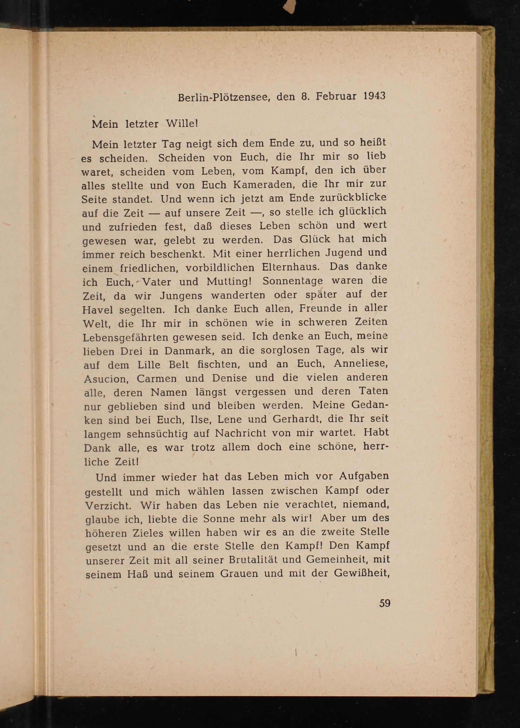 Mein letzter Tag neigt sich dem Ende zu, und so heißt es scheiden. Scheiden von Euch, die Ihr mir so lieb waret, scheiden vom Leben, vom Kampf, den ich über alles stellte und von Euch Kameraden, die Ihr mir zur Seite standet. Und wenn ich jetzt am Ende zurückblicke auf die Zeit- auf unsere Zeit so stelle ich glücklich und zufrieden fest, daß dieses Leben schön und wert gewesen war, gelebt zu werden. Das Glück hat mich immer reich beschenkt. Mit einer herrlichen Jugend und einem friedlichen, vorbildlichen Elternhaus. Das danke ich Euch, Vater und Mutting! Sonnentage waren die Zeit, da wir Jungens wanderten oder später auf der Havel segelten. Ich danke Euch allen, Freunde in aller Welt, die Ihr mir in schönen wie in schweren Zeiten Lebensgefährten gewesen seid. Ich denke an Euch, meine lieben Drei in Danmark, an die sorglosen Tage, als wir auf dem Lille Belt fischten, und an Euch, Anneliese, Asucion, Carmen und Denise und die vielen anderen alle, deren Namen längst vergessen und deren Taten nur geblieben sind und bleiben werden. Meine Gedanken sind bei Euch, Ilse, Lene und Gerhardt, die Ihr seit langem sehnsüchtig auf Nachricht von mir wartet. Habt Dank alle, es war trotz allem doch eine schöne, herrliche Zeit!