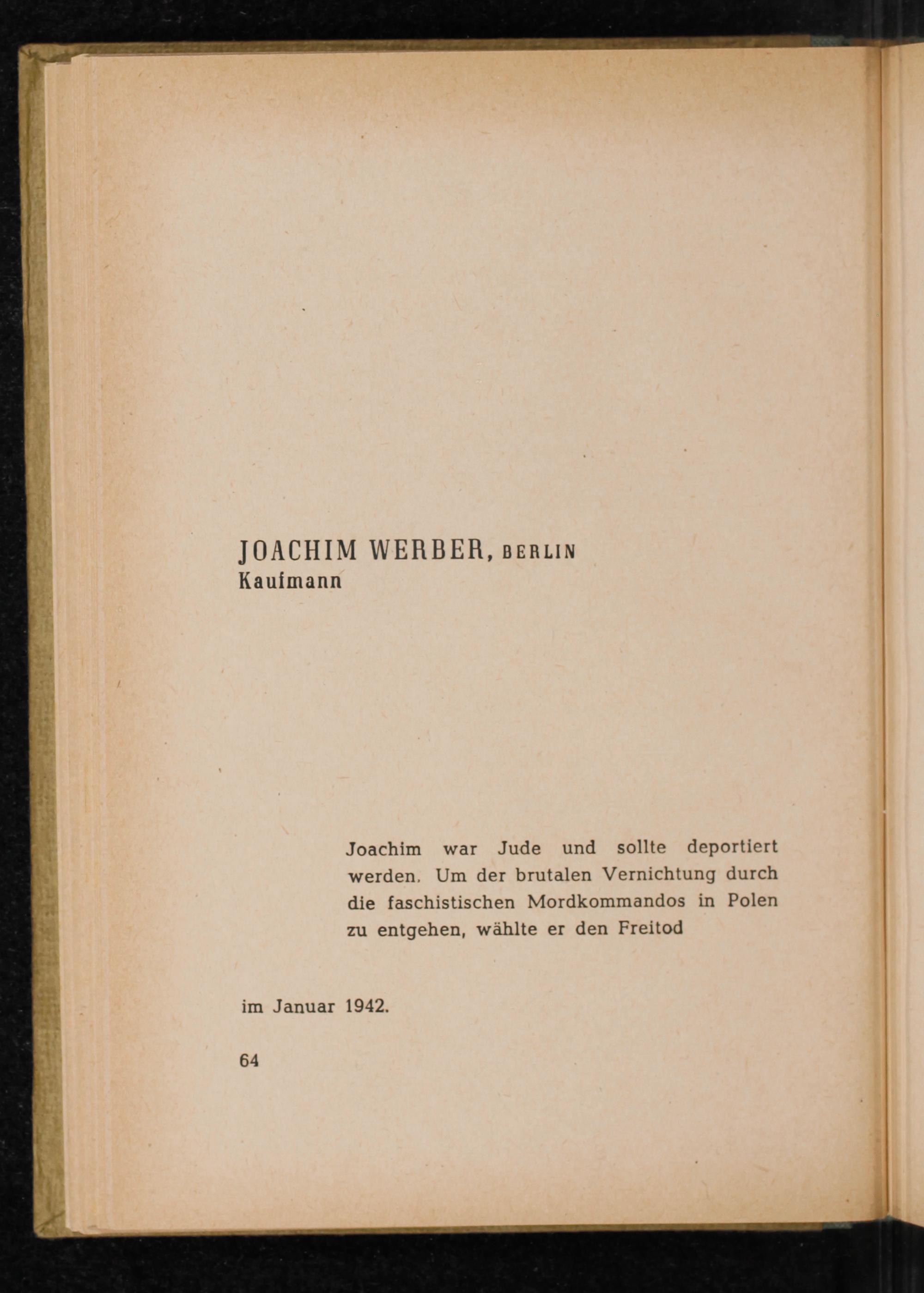 JOACHIM WERBER, BERLIN Kaufmann Joachim war Jude und sollte deportiert werden. Um der brutalen Vernichtung durch die faschistischen Mordkommandos in Polen zu entgehen, wählte er den Freitod im Januar 1942. 64