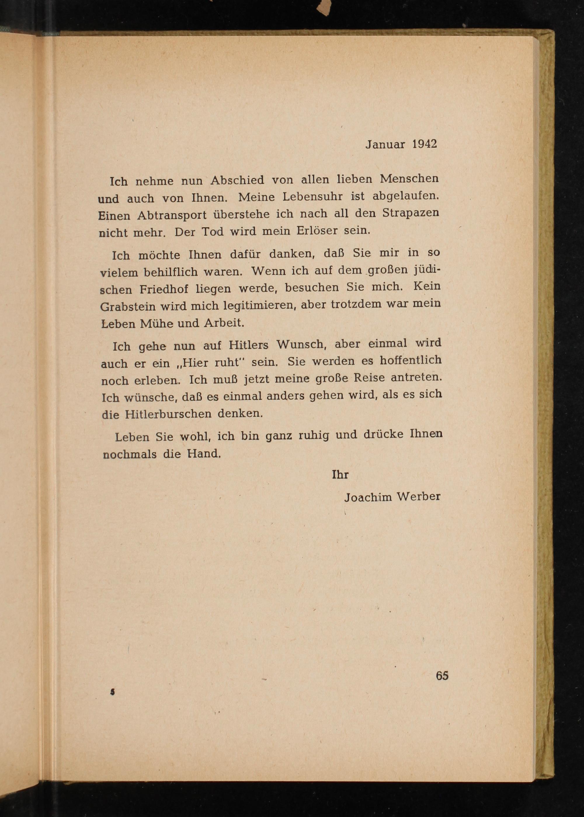 Ich gehe nun auf Hitlers Wunsch, aber einmal wird auch er ein ,, Hier ruht" sein. Sie werden es hoffentlich noch erleben. Ich muß jetzt meine große Reise antreten. Ich wünsche, daß es einmal anders gehen wird, als es sich die Hitlerburschen denken.