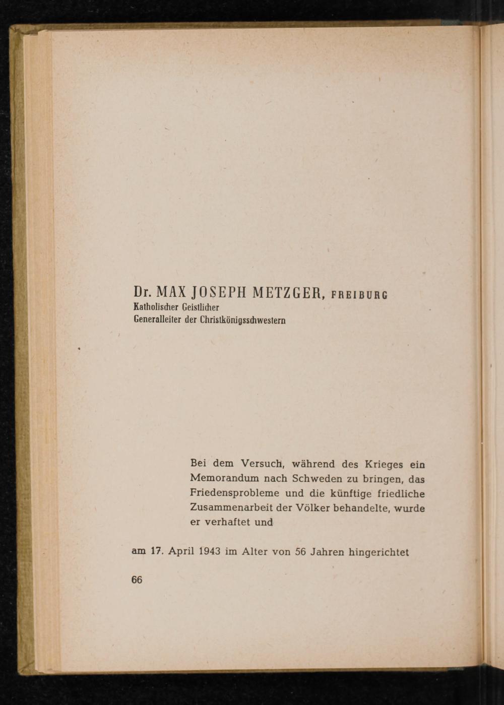 Dr. MAX JOSEPH METZGER , FREIBURG Katholischer Geistlicher Generalleiter der Christkönigsschwestern