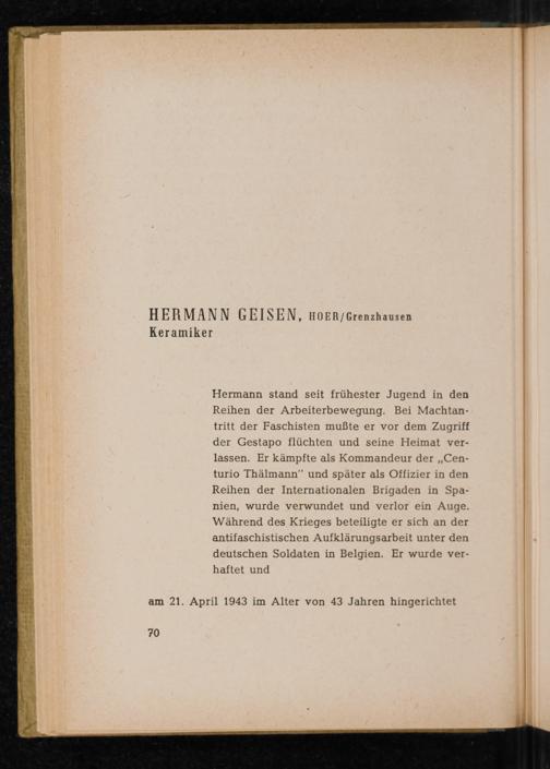 Hermann stand seit frühester Jugend in den Reihen der Arbeiterbewegung. Bei Machtantritt der Faschisten mußte er vor dem Zugriff der Gestapo flüchten und seine Heimat verlassen. Er kämpfte als Kommandeur der ,, Centurio Thälmann" und später als Offizier in den Reihen der Internationalen Brigaden in Spanien , wurde verwundet und verlor ein Auge. Während des Krieges beteiligte er sich an der antifaschistischen Aufklärungsarbeit unter den deutschen Soldaten in Belgien . Er wurde verhaftet und