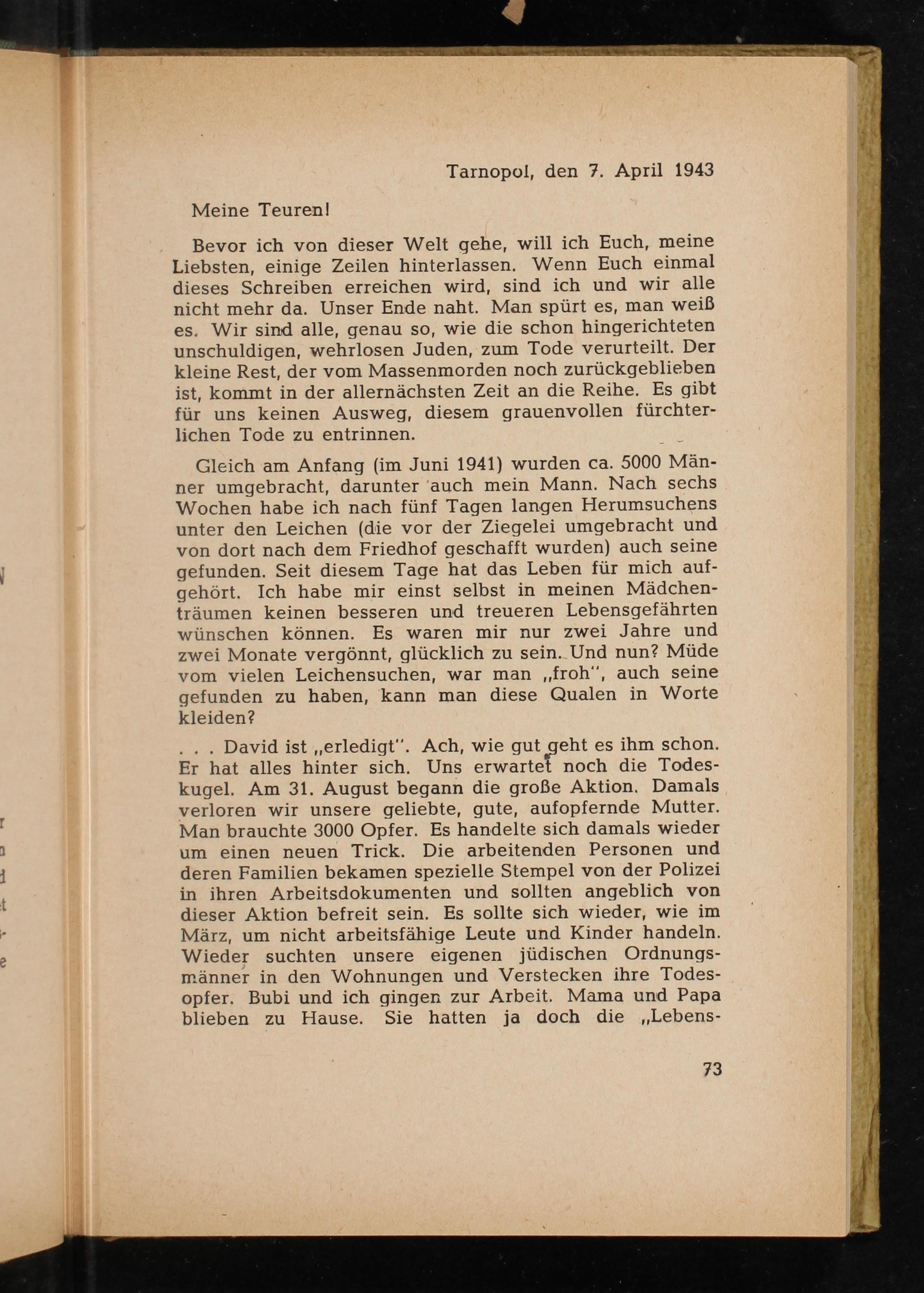 Bevor ich von dieser Welt gehe, will ich Euch, meine Liebsten, einige Zeilen hinterlassen. Wenn Euch einmal dieses Schreiben erreichen wird, sind ich und wir alle nicht mehr da. Unser Ende naht. Man spürt es, man weiß es. Wir sind alle, genau so, wie die schon hingerichteten unschuldigen, wehrlosen Juden, zum Tode verurteilt. Der kleine Rest, der vom Massenmorden noch zurückgeblieben ist, kommt in der allernächsten Zeit an die Reihe. Es gibt für uns keinen Ausweg, diesem grauenvollen fürchterlichen Tode zu entrinnen.