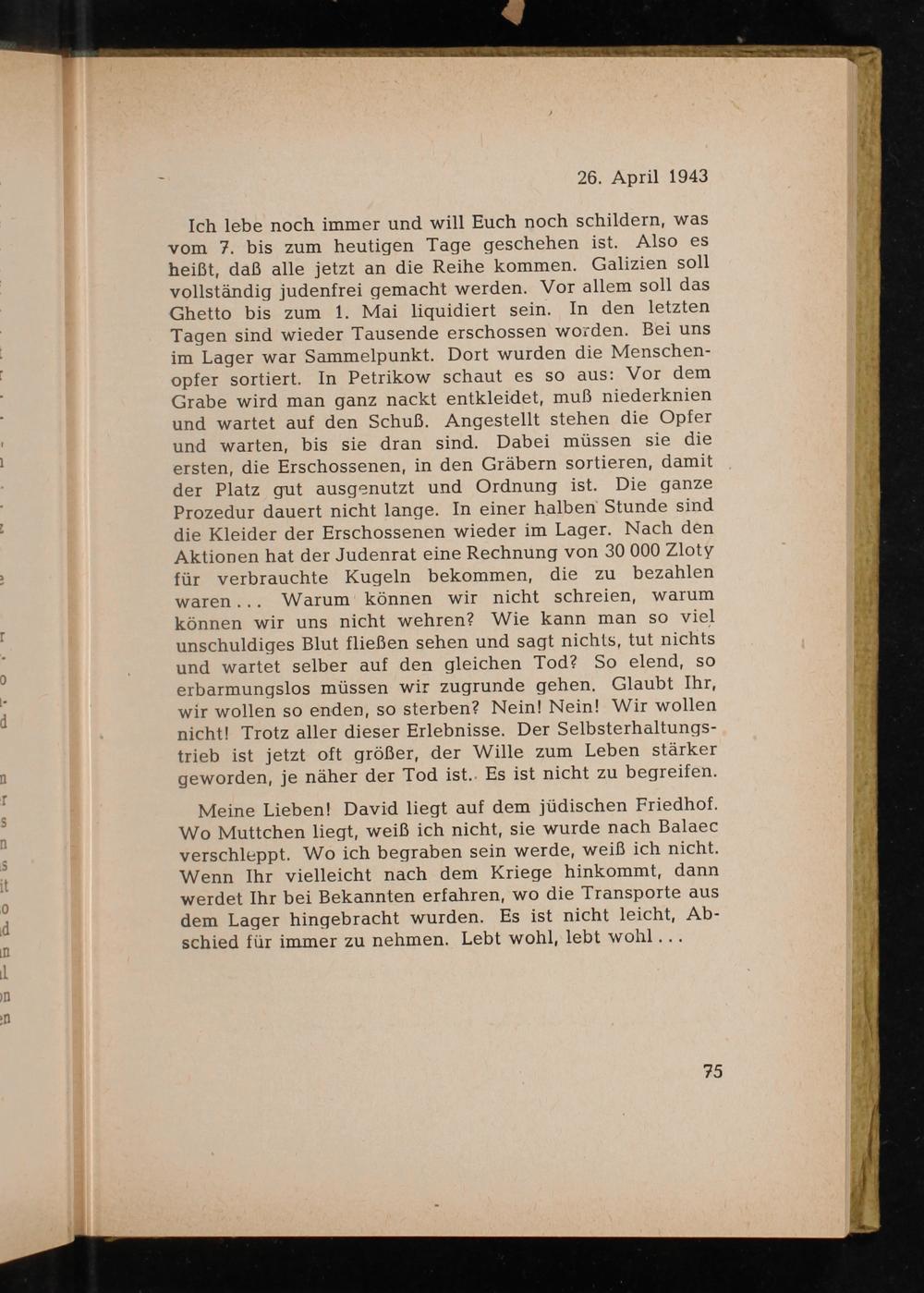 Ich lebe noch immer und will Euch noch schildern, was vom 7. bis zum heutigen Tage geschehen ist. Also es heißt, daß alle jetzt an die Reihe kommen. Galizien soll vollständig judenfrei gemacht werden. Vor allem soll das Ghetto bis zum 1. Mai liquidiert sein. In den letzten Tagen sind wieder Tausende erschossen worden. Bei uns im Lager war Sammelpunkt. Dort wurden die Menschen- opfer sortiert. In Petrikow schaut es so aus: Vor dem Grabe wird man ganz nackt entkleidet, muß niederknien und wartet auf den Schuß. Angestellt stehen die Opfer und warten, bis sie dran sind. Dabei müssen sie die ersten, die Erschossenen, in den Gräbern sortieren, damit der Platz gut ausgenutzt und Ordnung ist. Die ganze Prozedur dauert nicht lange. In einer halben Stunde sind die Kleider der Erschossenen wieder im Lager. Nach den Aktionen hat der Judenrat eine Rechnung von 30 000 Zloty für verbrauchte Kugeln bekommen, die zu bezahlen waren... Warum’ können wir nicht schreien, warum können wir uns nicht wehren? Wie kann man so viel unschuldiges Blut fließen sehen und sagt nichts, tut nichts und wartet selber auf den gleichen Tod? So elend, so erbarmungslos müssen wir zugrunde gehen. Glaubt Ihr, wir wollen so enden, so sterben? Nein! Nein! Wir wollen nicht! Trotz aller dieser Erlebnisse. Der Selbsterhaltungs - trieb ist jetzt oft größer, der Wille zum Leben stärker geworden, je näher der Tod ist.. Es ist nicht zu begreifen.