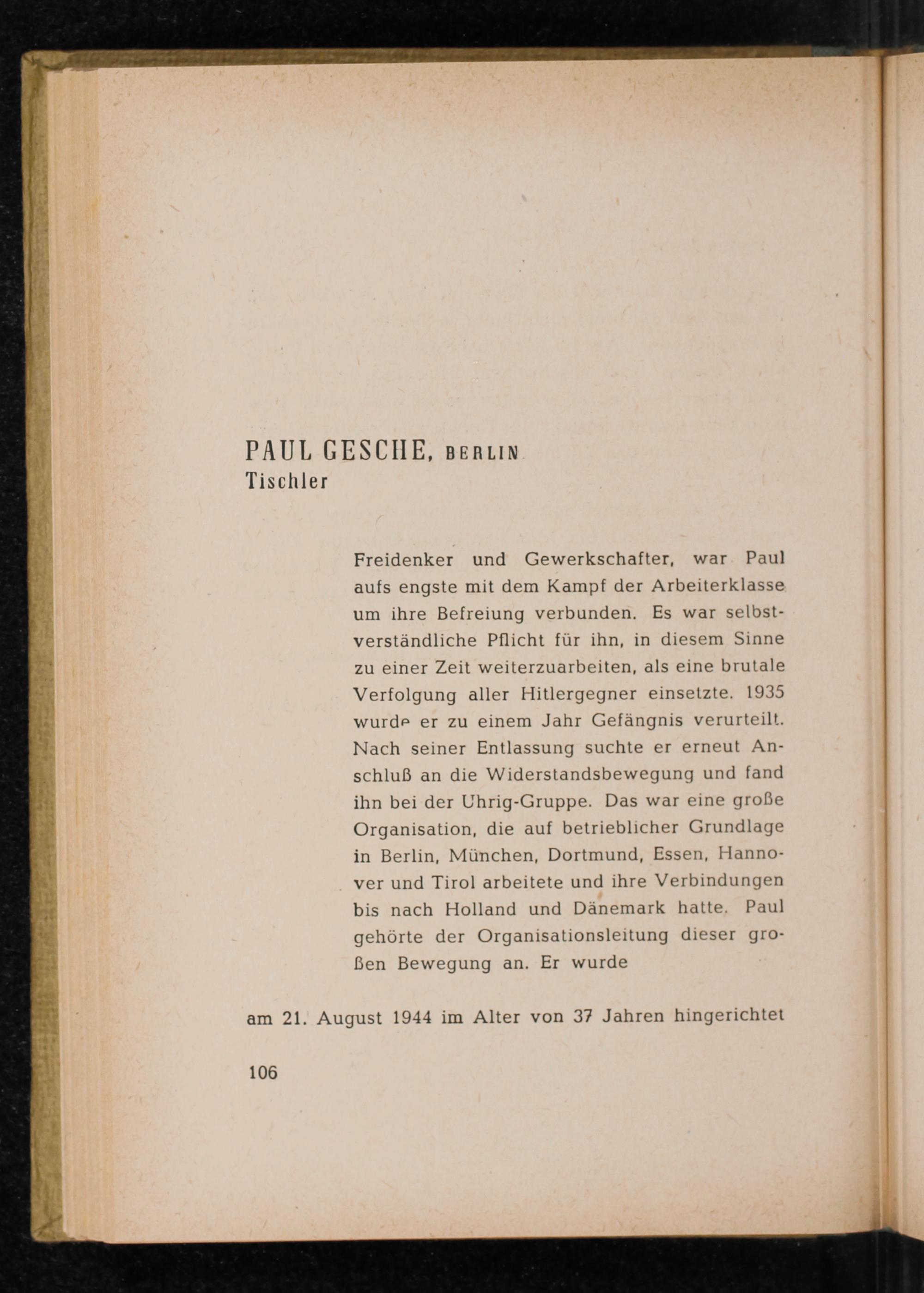 Freidenker und Gewerkschafter, war Paul aufs engste mit dem Kampf der Arbeiterklasse um ihre Befreiung verbunden. Es war selbstverständliche Pflicht für ihn, in diesem Sinne zu einer Zeit weiterzuarbeiten, als eine brutale Verfolgung aller Hitlergegner einsetzte. 1935 wurde er zu einem Jahr Gefängnis verurteilt. Nach seiner Entlassung suchte er erneut Anschluß an die Widerstandsbewegung und fand ihn bei der Uhrig- Gruppe. Das war eine große Organisation, die auf betrieblicher Grundlage in Berlin, München, Dortmund, Essen, Hannover und Tirol arbeitete und ihre Verbindungen bis nach Holland und Dänemark hatte. Paul gehörte der Organisationsleitung dieser groBen Bewegung an. Er wurde