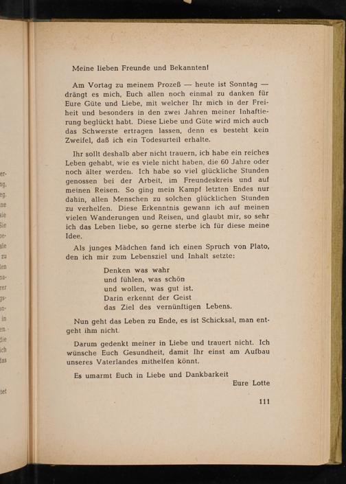 Am Vortag zu meinem Prozeß heute ist Sonntag drängt es mich, Euch allen noch einmal zu danken für Eure Güte und Liebe, mit welcher Ihr mich in der Frei- heit und besonders in den zwei Jahren meiner Inhaftie- rung beglückt habt. Diese Liebe und Güte wird mich auch das Schwerste ertragen lassen, denn es besteht kein Zweifel, daß ich ein Todesurteil erhalte.