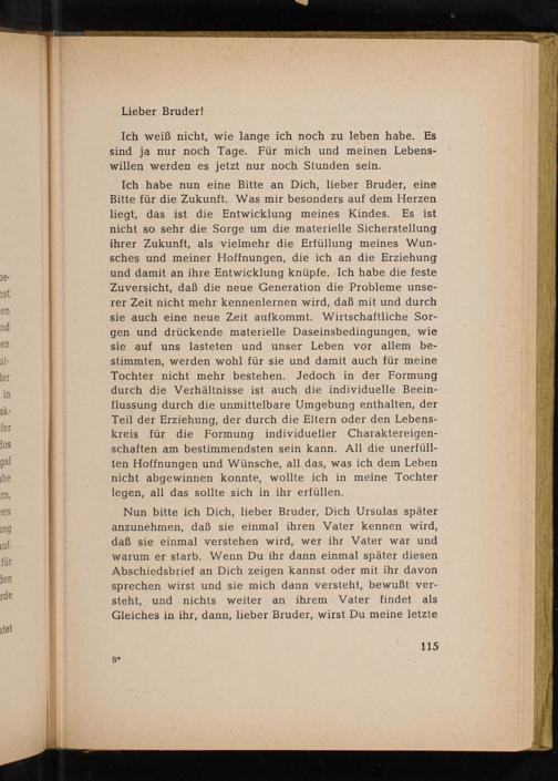 Nun bitte ich Dich, lieber Bruder, Dich Ursulas später anzunehmen, daß sie einmal ihren Vater kennen wird, daß sie einmal verstehen wird, wer ihr Vater war und warum er starb. Wenn Du ihr dann einmal später diesen Abschiedsbrief an Dich zeigen kannst oder mit ihr davon sprechen wirst und sie mich dann versteht, bewußt ver- steht, und nichts weiter an ihrem Vater findet als Gleiches in ihr, dann, lieber Bruder, wirst Du meine letzte