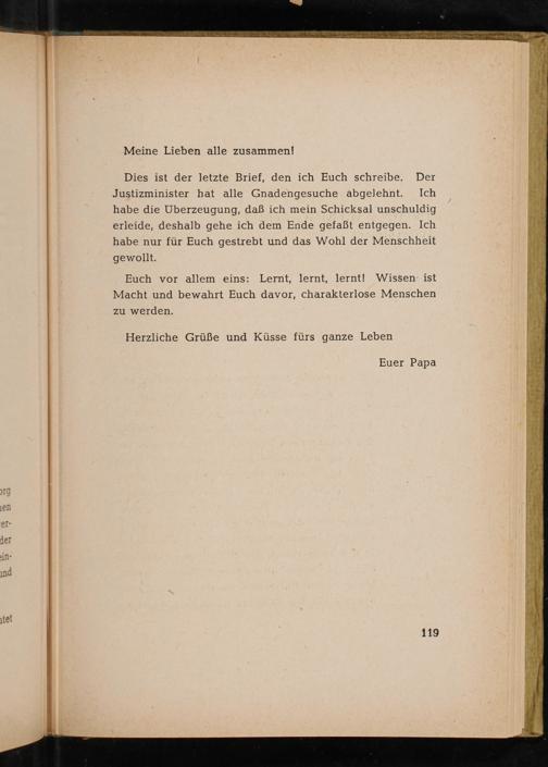 Dies ist der letzte Brief, den ich Euch schreibe. Der Justizminister hat alle Gnadengesuche abgelehnt. Ich habe die Überzeugung, daß ich mein Schicksal unschuldig erleide, deshalb gehe ich dem Ende gefaßt entgegen. Ich habe nur für Euch gestrebt und das Wohl der Menschheit gewollt.