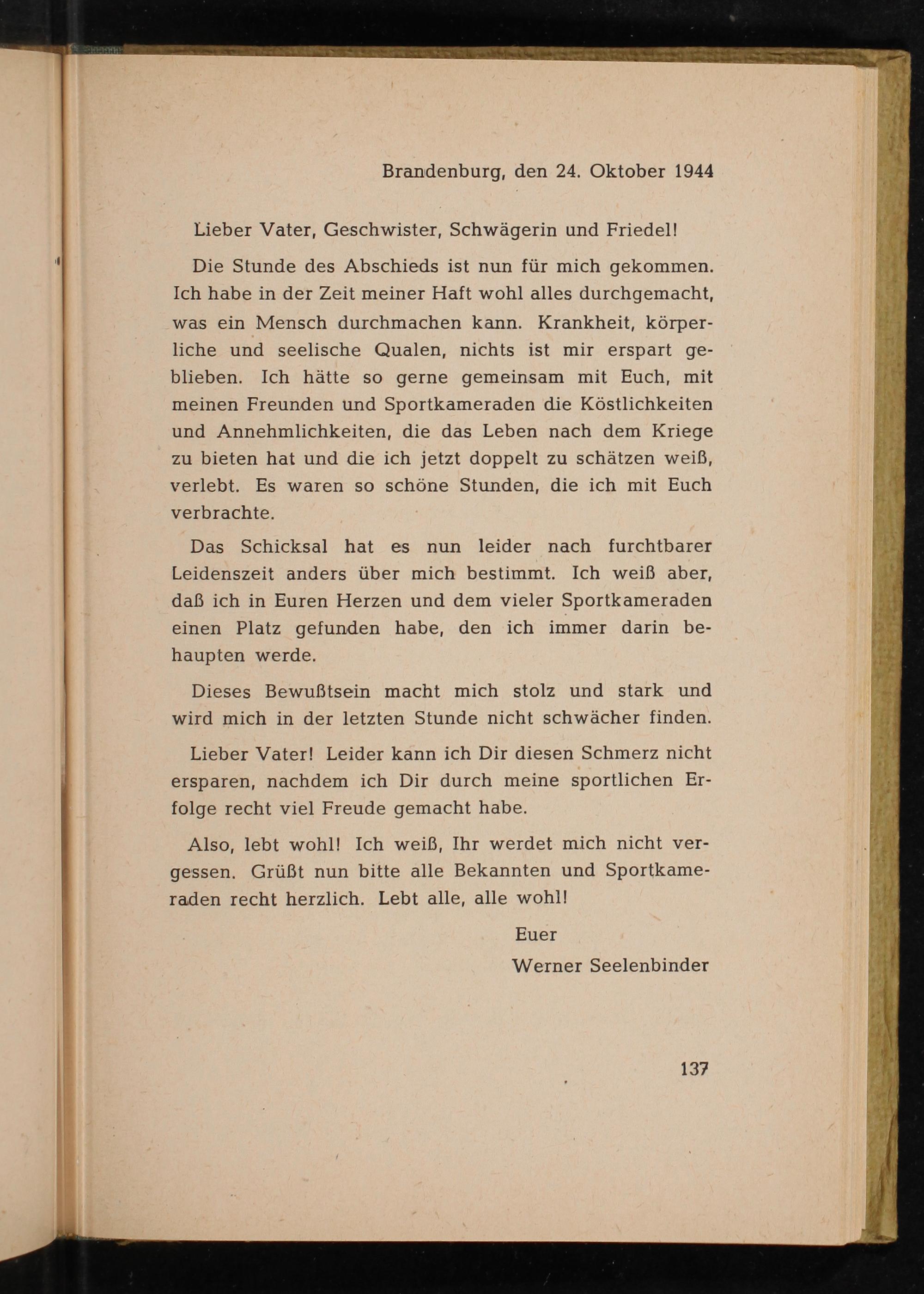 Die Stunde des Abschieds ist nun für mich gekommen. Ich habe in der Zeit meiner Haft wohl alles durchgemacht, was ein Mensch durchmachen kann. Krankheit, körperliche und seelische Qualen, nichts ist mir erspart geblieben. Ich hätte so gerne gemeinsam mit Euch, mit meinen Freunden und Sportkameraden die Köstlichkeiten und Annehmlichkeiten, die das Leben nach dem Kriege zu bieten hat und die ich jetzt doppelt zu schätzen weiß, verlebt. Es waren so schöne Stunden, die ich mit Euch verbrachte.
