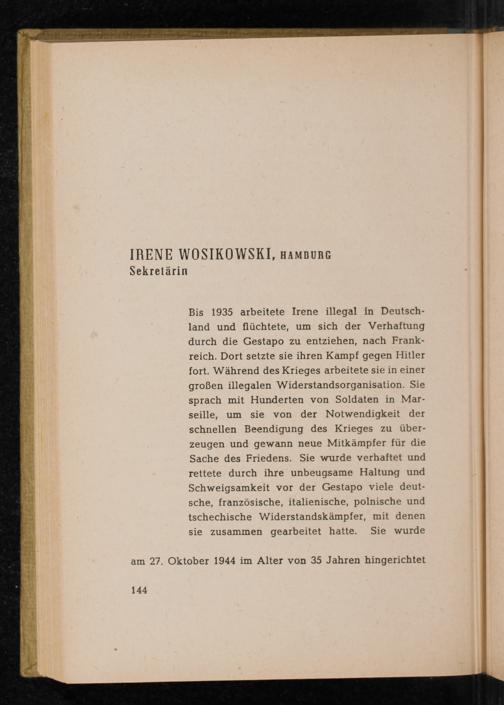 Bis 1935 arbeitete Irene illegal in Deutschland und flüchtete, um sich der Verhaftung durch die Gestapo zu entziehen, nach Frankreich. Dort setzte sie ihren Kampf gegen Hitler fort. Während des Krieges arbeitete sie in einer großen illegalen Widerstandsorganisation. Sie sprach mit Hunderten von Soldaten in Marseille , um sie von der Notwendigkeit der schnellen Beendigung des Krieges zu überzeugen und gewann neue Mitkämpfer für die Sache des Friedens. Sie wurde verhaftet und rettete durch ihre unbeugsame Haltung und Schweigsamkeit vor der Gestapo viele deutsche, französische, italienische, polnische und tschechische Widerstandskämpfer, mit denen sie zusammen gearbeitet hatte. Sie wurde