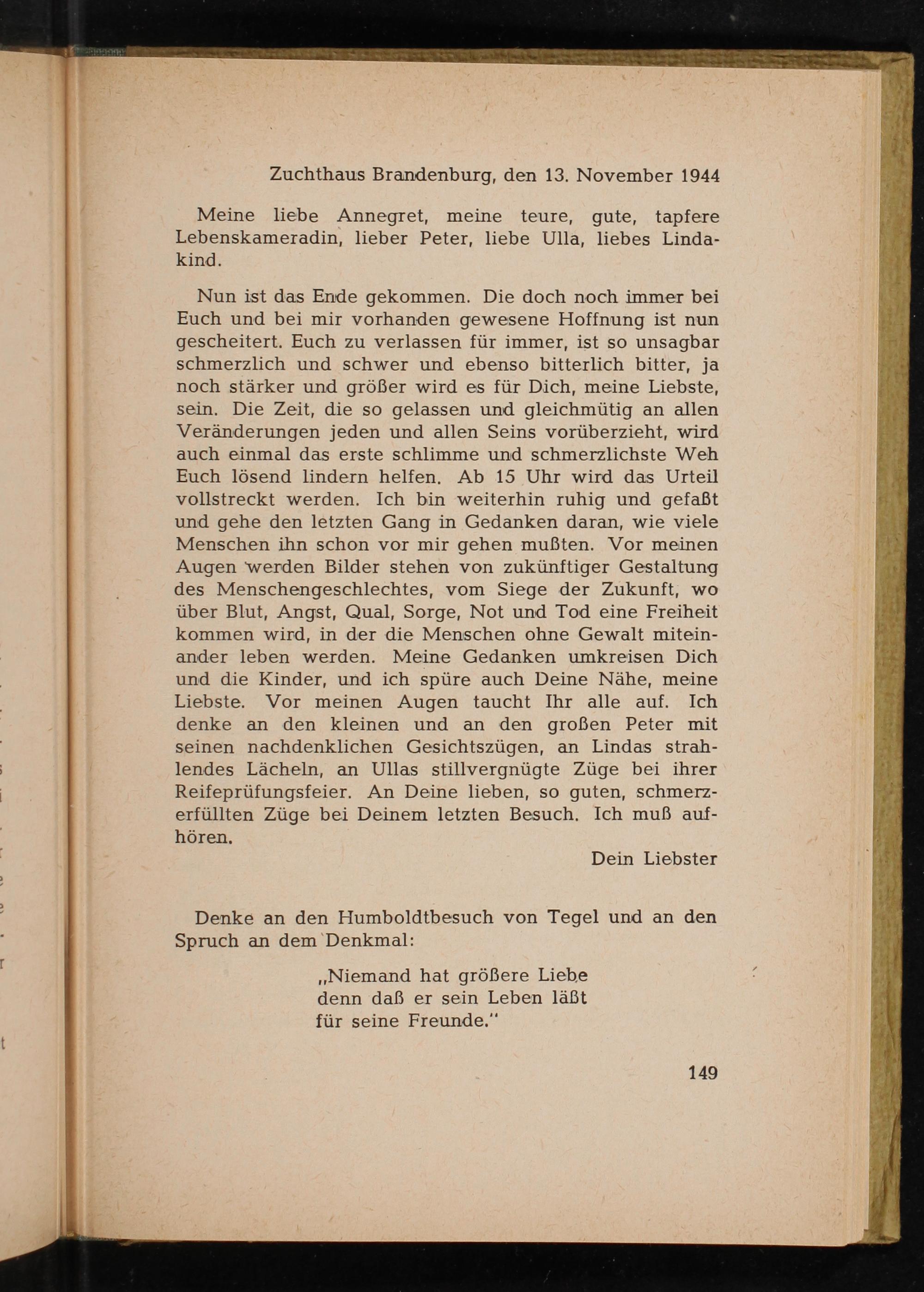Nun ist das Ende gekommen. Die doch noch immer bei Euch und bei mir vorhanden gewesene Hoffnung ist nun gescheitert. Euch zu verlassen für immer, ist so unsagbar schmerzlich und schwer und ebenso bitterlich bitter, ja noch stärker und größer wird es für Dich, meine Liebste, sein. Die Zeit, die so gelassen und gleichmütig an allen Veränderungen jeden und allen Seins vorüberzieht, wird auch einmal das erste schlimme und schmerzlichste Weh Euch lösend lindern helfen. Ab 15 Uhr wird das Urteil vollstreckt werden. Ich bin weiterhin ruhig und gefaßt und gehe den letzten Gang in Gedanken daran, wie viele Menschen ihn schon vor mir gehen mußten. Vor meinen Augen werden Bilder stehen von zukünftiger Gestaltung des Menschengeschlechtes, vom Siege der Zukunft, wo über Blut, Angst, Qual, Sorge, Not und Tod eine Freiheit kommen wird, in der die Menschen ohne Gewalt mitein- ander leben werden. Meine Gedanken umkreisen Dich und die Kinder, und ich spüre auch Deine Nähe, meine Liebste. Vor meinen Augen taucht Ihr alle auf. Ich denke an den kleinen und an den großen Peter mit seinen nachdenklichen Gesichtszügen, an Lindas strah- lendes Lächeln, an Ullas stillvergnügte Züge bei ihrer Reifeprüfungsfeier. An Deine lieben, so guten, schmerz- erfüllten Züge bei Deinem letzten Besuch. Ich muß auf- hören.