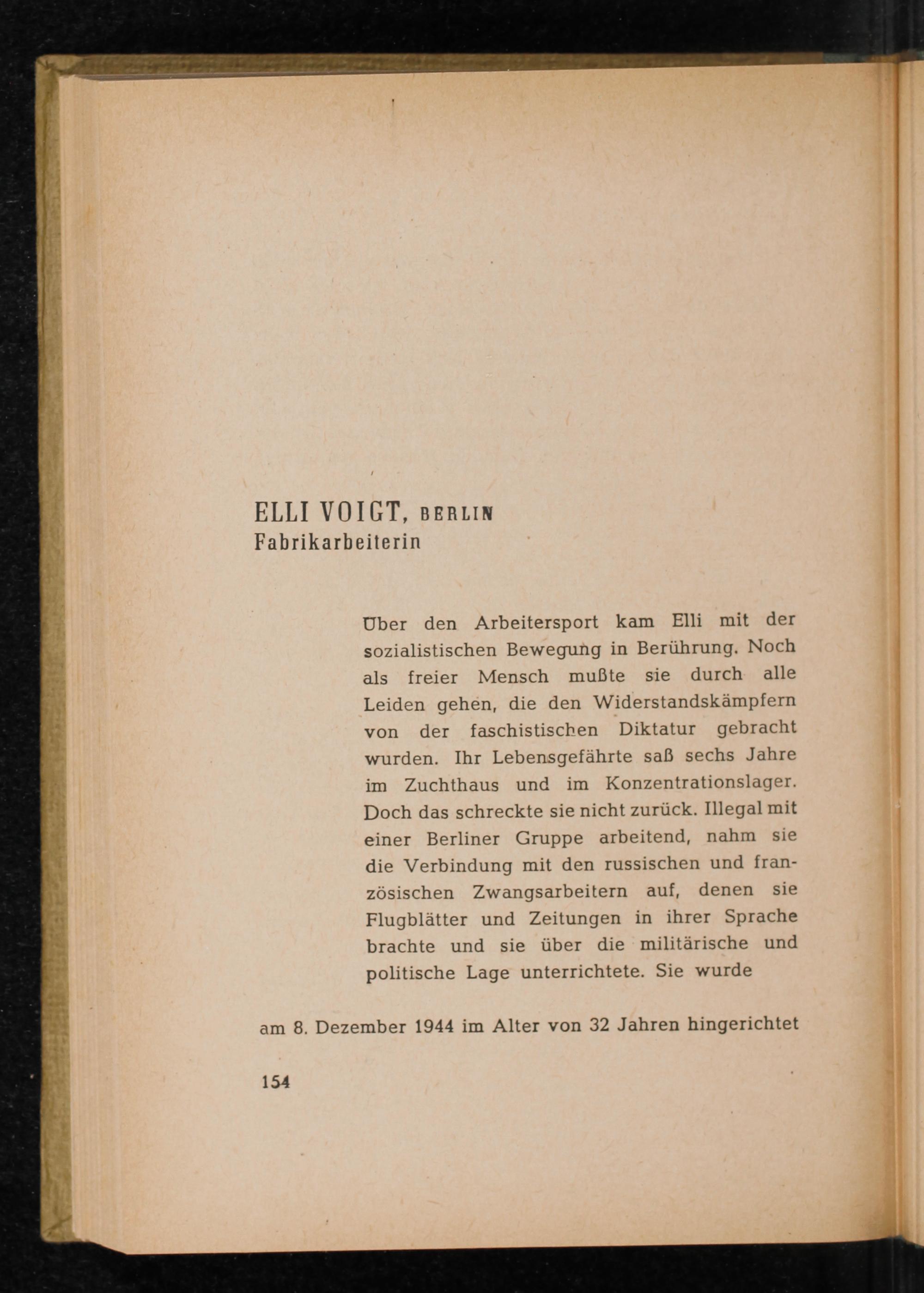 Uber den Arbeitersport kam Elli mit der sozialistischen Bewegung in Berührung. Noch als freier Mensch mußte sie durch alle Leiden gehen, die den Widerstandskämpfern von der faschistischen Diktatur gebracht wurden. Ihr Lebensgefährte saß sechs Jahre im Zuchthaus und im Konzentrationslager. Doch das schreckte sie nicht zurück. Illegal mit einer Berliner Gruppe arbeitend, nahm sie die Verbindung mit den russischen und französischen Zwangsarbeitern auf, denen sie Flugblätter und Zeitungen in ihrer Sprache brachte und sie über die militärische und politische Lage unterrichtete. Sie wurde