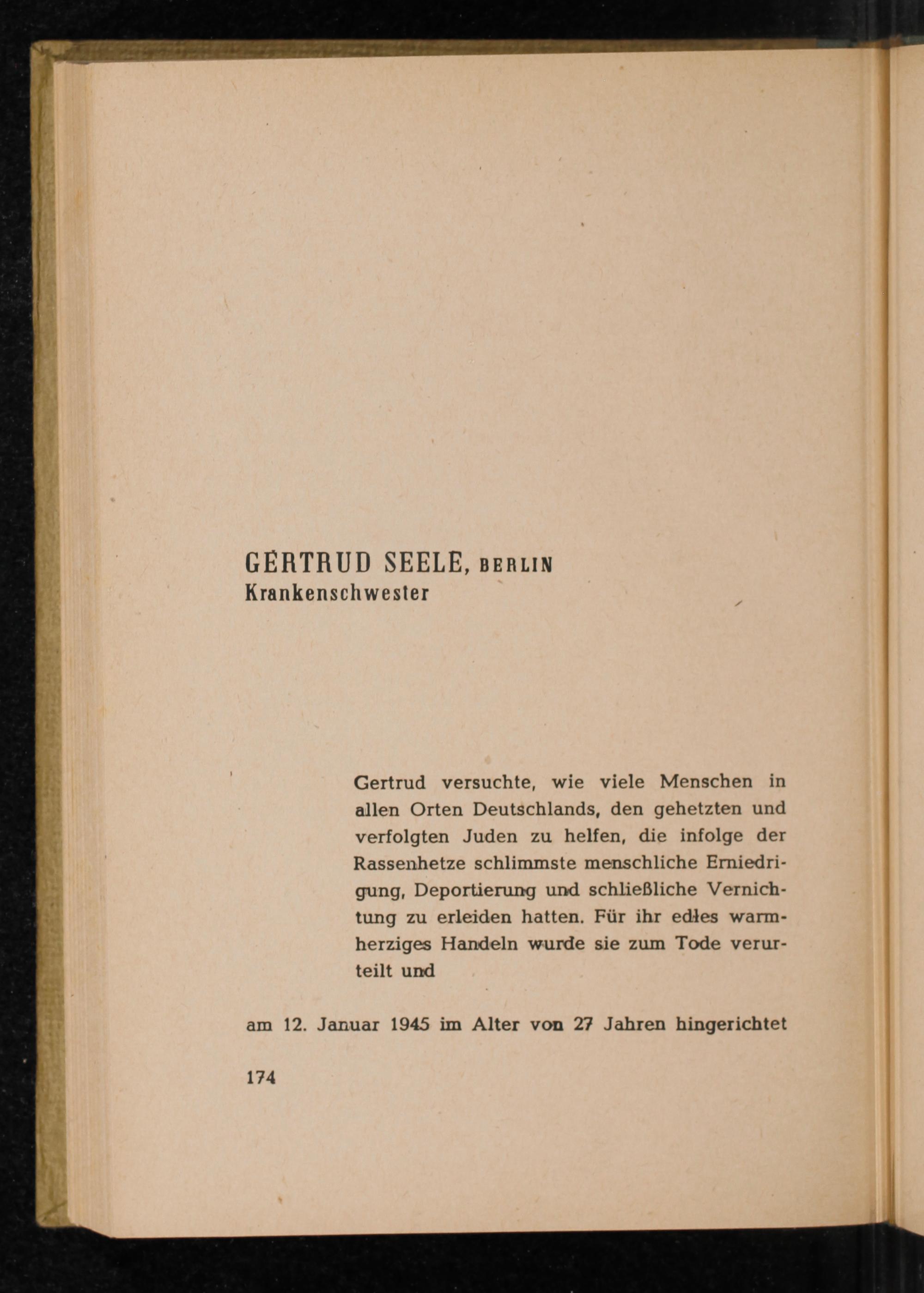 Gertrud versuchte, wie viele Menschen in allen Orten Deutschlands , den gehetzten und verfolgten Juden zu helfen, die infolge der Rassenhetze schlimmste menschliche Erniedrigung, Deportierung und schließliche Vernichtung zu erleiden hatten. Für ihr edles warmherziges Handeln wurde sie zum Tode verurteilt und