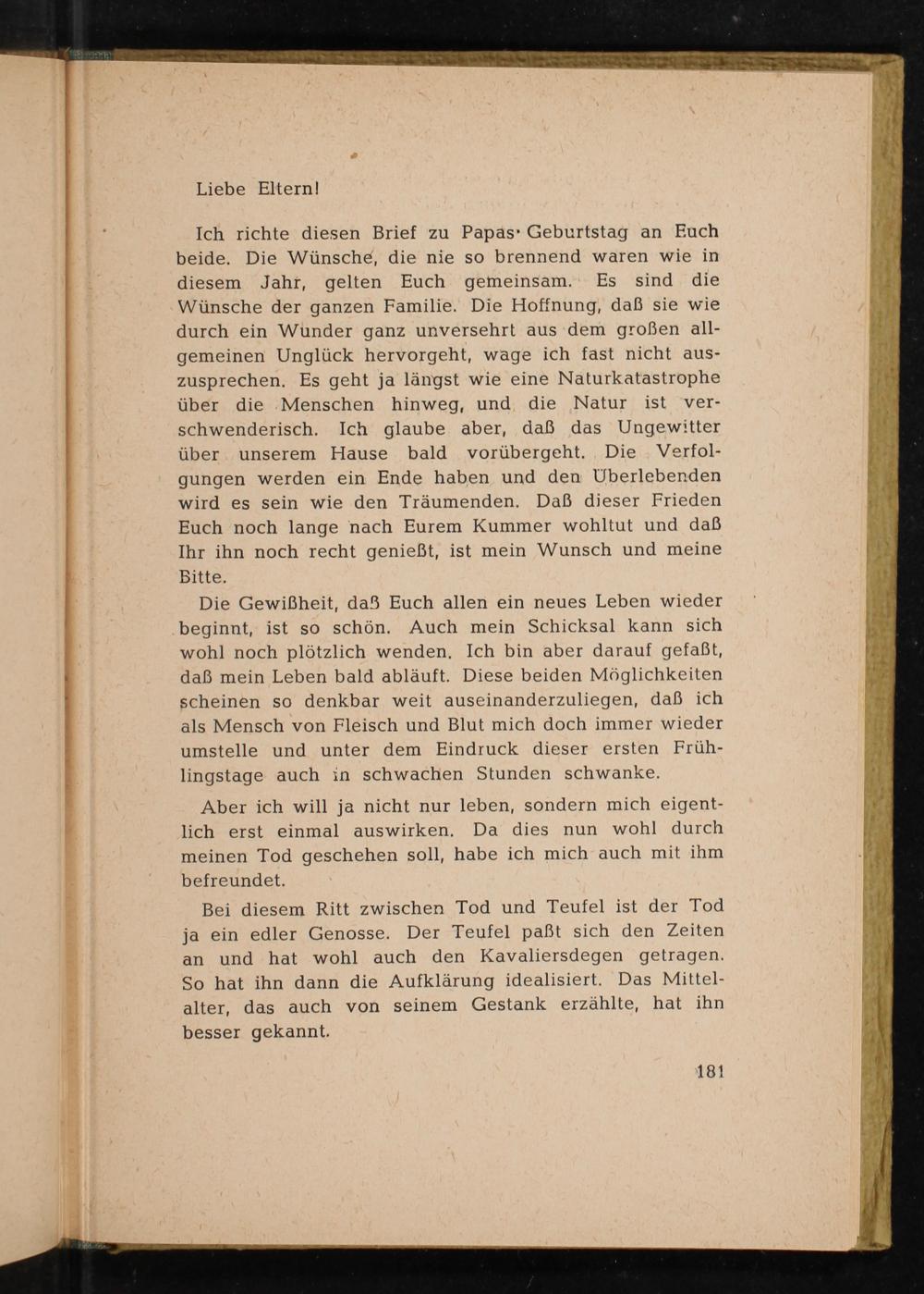Ich richte diesen Brief zu Papas Geburtstag an Euch beide. Die Wünsche, die nie so brennend waren wie in diesem Jahr, gelten Euch gemeinsam. Es sind die Wünsche der ganzen Familie. Die Hoffnung, daß sie wie durch ein Wunder ganz unversehrt aus dem großen allgemeinen Unglück hervorgeht, wage ich fast nicht auszusprechen. Es geht ja längst wie eine Naturkatastrophe über die Menschen hinweg, und die Natur ist verschwenderisch. Ich glaube aber, daß das Ungewitter über unserem Hause bald vorübergeht. Die Verfolgungen werden ein Ende haben und den Überlebenden wird es sein wie den Träumenden. Daß dieser Frieden Euch noch lange nach Eurem Kummer wohltut und daß Ihr ihn noch recht genießt, ist mein Wunsch und meine Bitte.