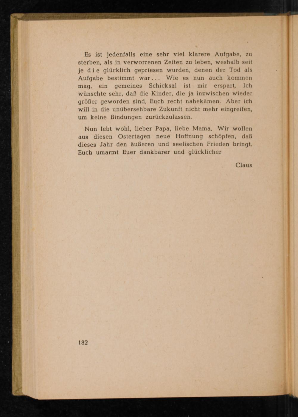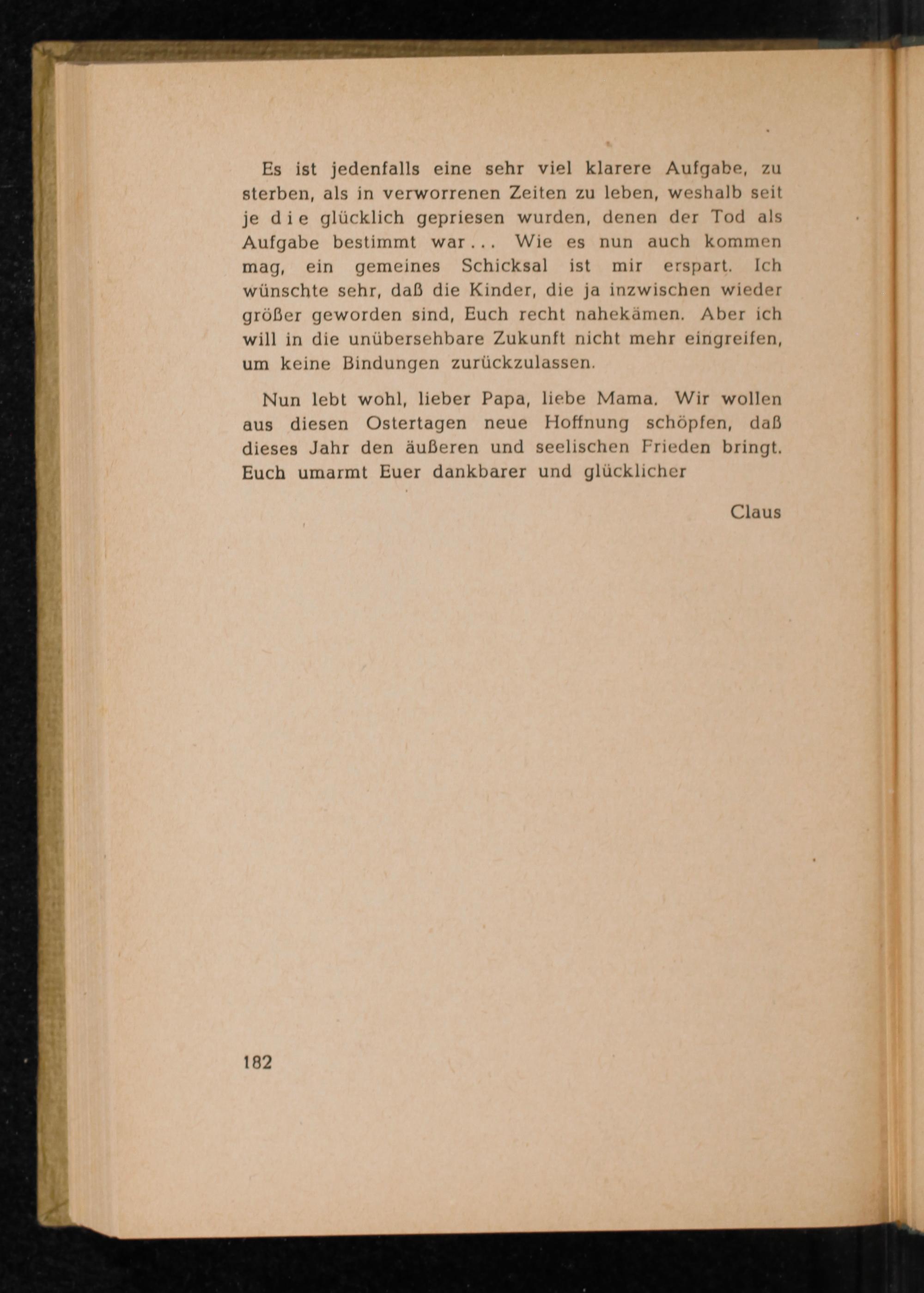 Nun lebt wohl, lieber Papa, liebe Mama. Wir wollen aus diesen Ostertagen neue Hoffnung schöpfen, daß dieses Jahr den äußeren und seelischen Frieden bringt. Euch umarmt Euer dankbarer und glücklicher
