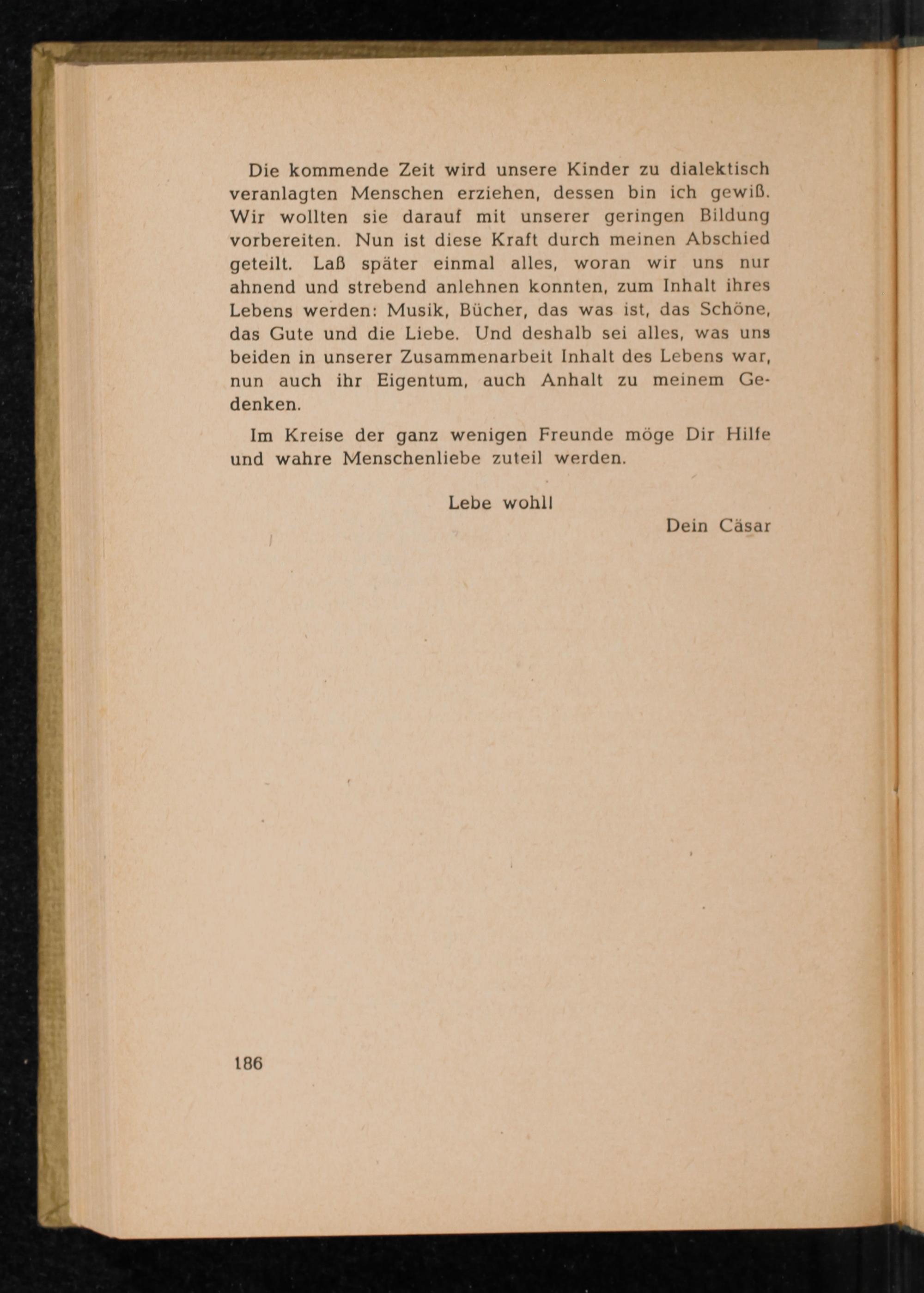 Die kommende Zeit wird unsere Kinder zu dialektisch veranlagten Menschen erziehen, dessen bin ich gewiß. Wir wollten sie darauf mit unserer geringen Bildung vorbereiten. Nun ist diese Kraft durch meinen Abschied geteilt. Laẞ später einmal alles, woran wir uns nur ahnend und strebend anlehnen konnten, zum Inhalt ihres Lebens werden: Musik, Bücher, das was ist, das Schöne, das Gute und die Liebe. Und deshalb sei alles, was uns beiden in unserer Zusammenarbeit Inhalt des Lebens war, nun auch ihr Eigentum, auch Anhalt zu meinem Gedenken.
