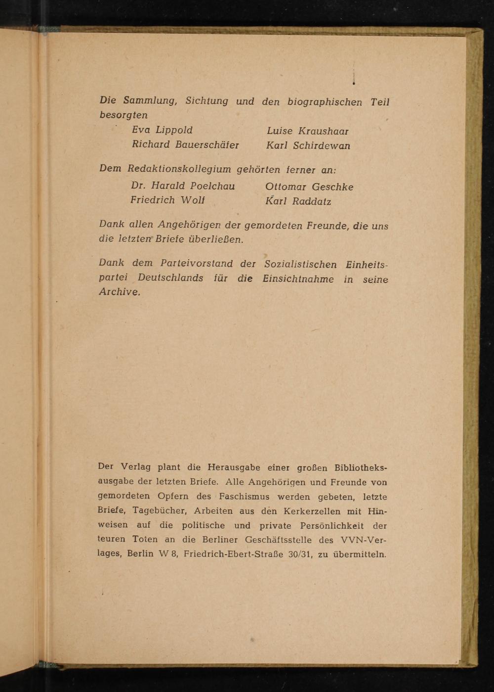 Der Verlag plant die Herausgabe einer großen Bibliotheks- ausgabe der letzten Briefe. Alle Angehörigen und Freunde von gemordeten Opfern des Faschismus werden gebeten, letzte Briefe, Tagebücher, Arbeiten aus den Kerkerzellen mit Hin- weisen auf die politische und private Persönlichkeit der teuren Toten an die Berliner Geschäftsstelle des VVN-Ver- lages, Berlin W 8, Friedrich-Ebert-Straße 30/31, zu übermitteln.