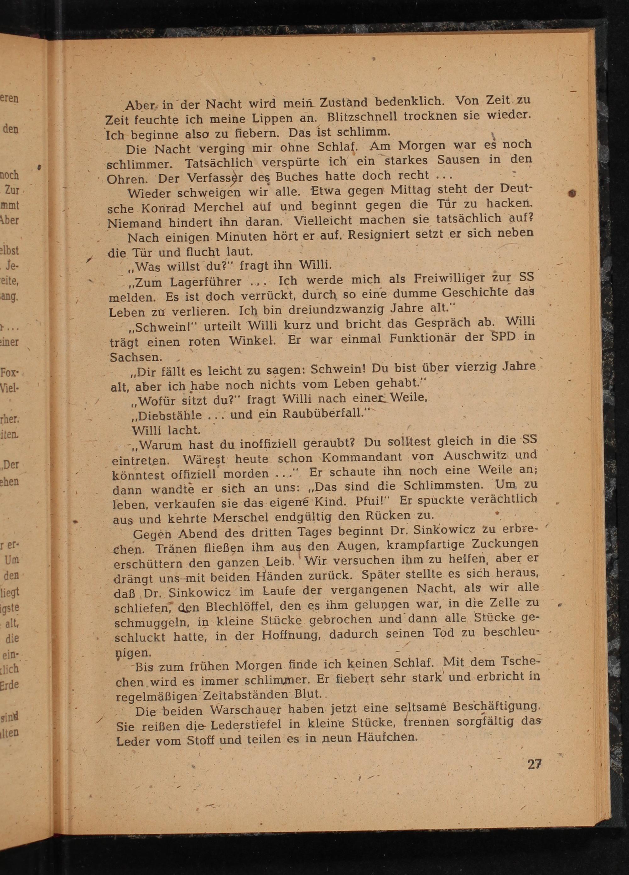 melden. Es ist doch verrückt, durch so eine dumme Geschichte das Leben zu verlieren. Ich bin dreiundzwanzig Jahre alt.”; „Schweinl" urteilt Willi kurz und bricht das Gespräch ab. Willi trägt einen roten Winkel. Er war einmal Funktionär der SPD. in ‘Sachsen . y|': „Dir fällt es leicht zu sagen: Schwein! Du bist über vierzig Jahre. alt, aber ich habe noch nichts vom Leben gehabt.’ „Wofür sitzt du?“ fragt Willi nach einer: Weile, „Diebstähle... und ein Raubüberfall.” Willi lacht. a ‚- Warum hast du inoffiziell geraubt? Du solltest gleich in die‘SS eintreten. Wärest heute schon Kommandant vom Auschwitz und könntest offiziell morden...". Er schaute ihn noch eine Weile an; dann wandte er sich an uns:„Das sind die Schlimmsten. Um zu jeben, verkaufen sie das eigen€@ Kind. Pfui!" Er spückte verächtlich . aus und kehrte Merschel endgültig den Rücken zu.” Gegen Abend‘des dritten Tages beginnt Dr. Sinkowicz zu erbre- chen. Tränen fließen ihm aus den Augen, krampfartige Zuckungen erschüttern den ganzen Leib. Wir versuchen ihm zu heifen, aber er drängt uns-mit beiden Händen zurück. Später stellte es sich heraus, daß Dr. Sinkowicz im Laufe der vergangenen Nacht, als wir alle schliefen, den Blechlöffel, den es ihm gelungen war, in die Zelle zu schmuggeln, in kleine Stücke gebrochen und’dann alle Stücke ge- ‚ schluckt hatte, in der Hoffnung, dadurch seinen Tod zu beschleu-- pigen. ba j re, er 2 -Bis zum frühen Morgen finde ich keinen Schlaf. Mit dem Tsche- chen wird es immer schlimmer. Er fiebert sehr stark und.erbricht in regelmäßigen Zeitabständen Blut.. Die beiden Warschauer haben jetzt eine seltsam& Beschäftigung. Sie reißen die Lederstiefel in kleine Stücke,{rennen sorgfältig das Leder vom Stoff und teilen es in neun Häufchen, i