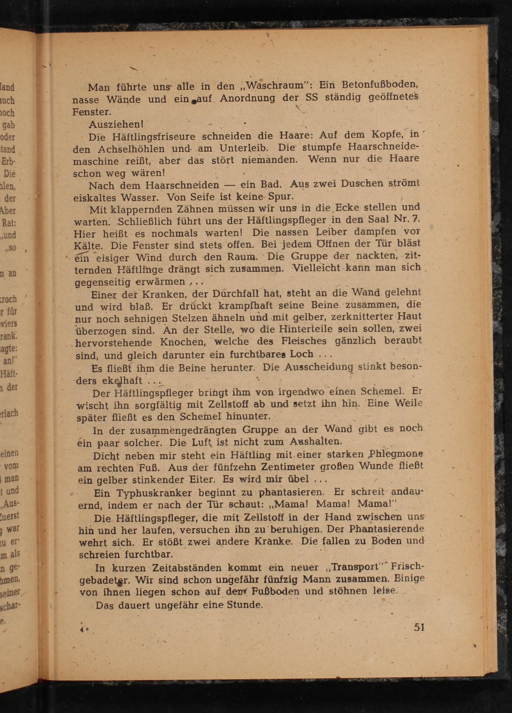 In kurzen Zeitabständen kommt ein neuer Transport" Frischgebadeter. Wir sind schon ungefähr fünfzig Mann zusammen. Einige von ihnen liegen schon auf dem Fußboden und stöhnen leise. Das dauert ungefähr eine Stunde.