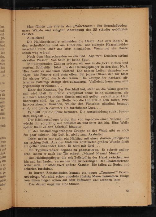 Man führte uns alle in den ,, Waschraum": Ein Betonfußboden, nasse Wände und ein auf Anordnung der SS ständig geöffnetes Fenster.