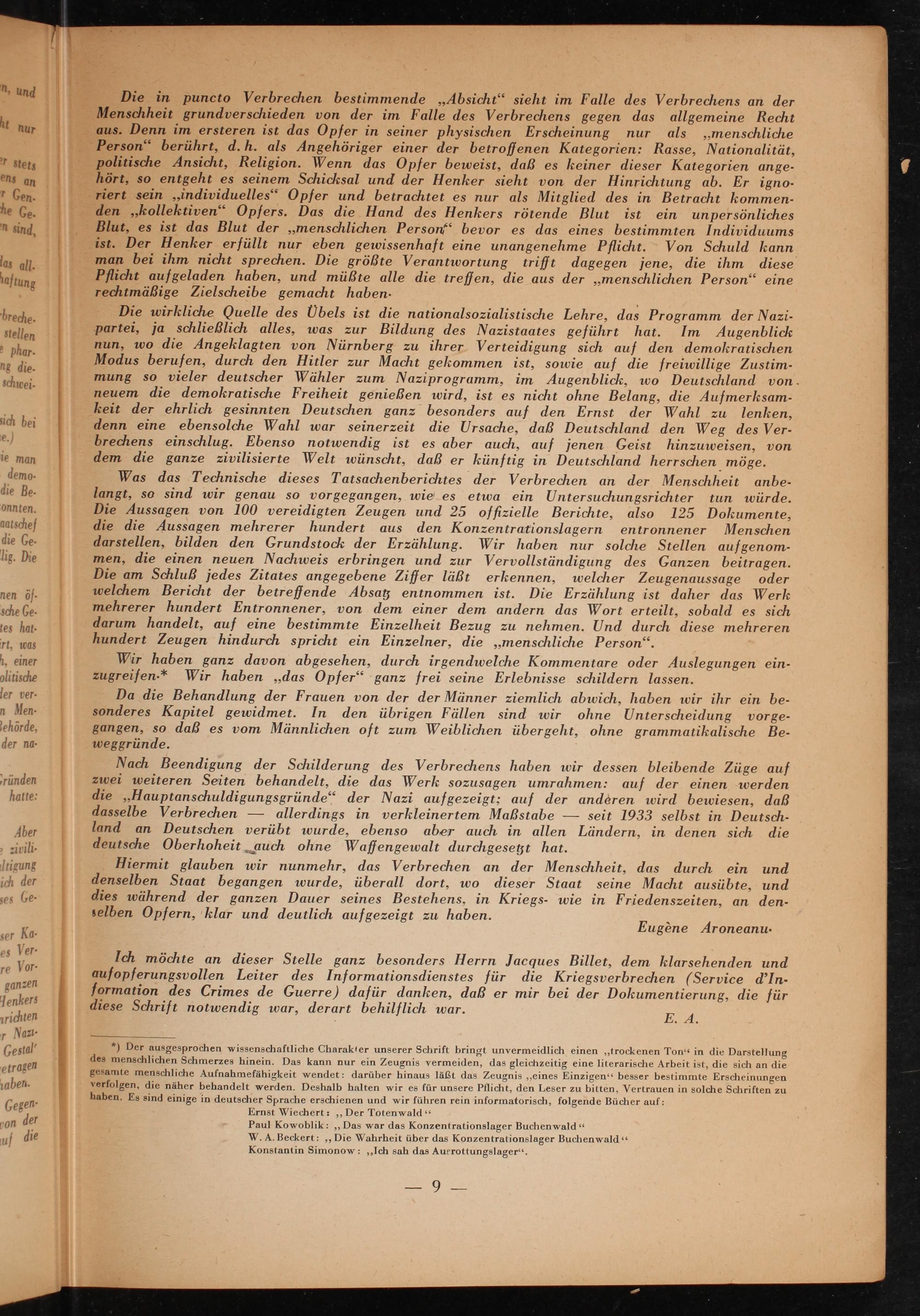 Nach Beendigung der Schilderung des Verbrechens haben wir dessen bleibende Züge auf zwei weiteren Seiten behandelt, die das Werk sozusagen umrahmen: auf der einen“werden die„Hauptanschuldigungsgründe“ der Nazi aufgezeigt; auf der anderen wird bewiesen, daß dasselbe Verbrechen— allerdings in verkleinertem Maßstabe— seit 1933 selbst in Deutsch - land an Deutschen verübt wurde, ebenso aber auch in allen Ländern, in denen sich die deutsche Oberhoheit_auch ohne Waffengewalt durchgesett hat.