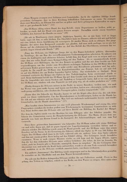 ,, Einer der SS - Leute, ein 19 jähriger Junge, der zu den Bagno- Aufsehern gehörte, überwachte die Sträflinge, die am Bau des vervollkommneten Verbrennungsofens arbeiteten. Er näherte sich einem der kräftigsten und schönsten Arbeiter, befahl ihm, den Kopf nach vorn zu neigen und versetzte ihm aus voller Kraft einen Knüppelschlag auf den Nacken. Als er zusammenbrach, befahl der SS- Mann zwei Häftlingen, ihn bei den Beinen zu packen und ihn mit dem Gesicht zur Erde wegzuschleppen, um ihn wieder zum Bewußtsein zu bringen. Nachdem sie ihn 100 Meter über den gefrorenen Boden gezerrt hatten, war er nicht wieder zum Bewußtsein gekommen und lag unbeweglich da. Da ergriff der SS- Mann eine Kanalisationsröhre aus Zement, hob sie auf und ließ sie auf den Rücken des am Boden liegenden Opfers fallen. Das wiederholte er fünfmal. Beim erstenmal erzitterte der Körper des Opfers in den Todeskrämpfen, beim zweitenmal wurde er steif. Beim fünftenmal befahl der SS- Mann ihn mit dem Gesicht nach oben zu drehen und spreizte ihm die Augenlider mit einem Stecken auf. Nachdem er festgestellt hatte, daß er tot war, spuckte der SS- Mann aus, zündete sich eine Zigarette an und ging weg, als ob nichts geschehen sei."( 110) ,, Häufig drangen die SS - Leute mitten in der Nacht in unsere Baracken, treiben uns, wie auch das Wetter war, ganz nackt heraus und lassen uns kriechen, laufen usw.; diejenigen, welche es nicht rasch genug ausführten, oder Zeichen des Versagens gaben, wurden totgepeitscht."( 22)