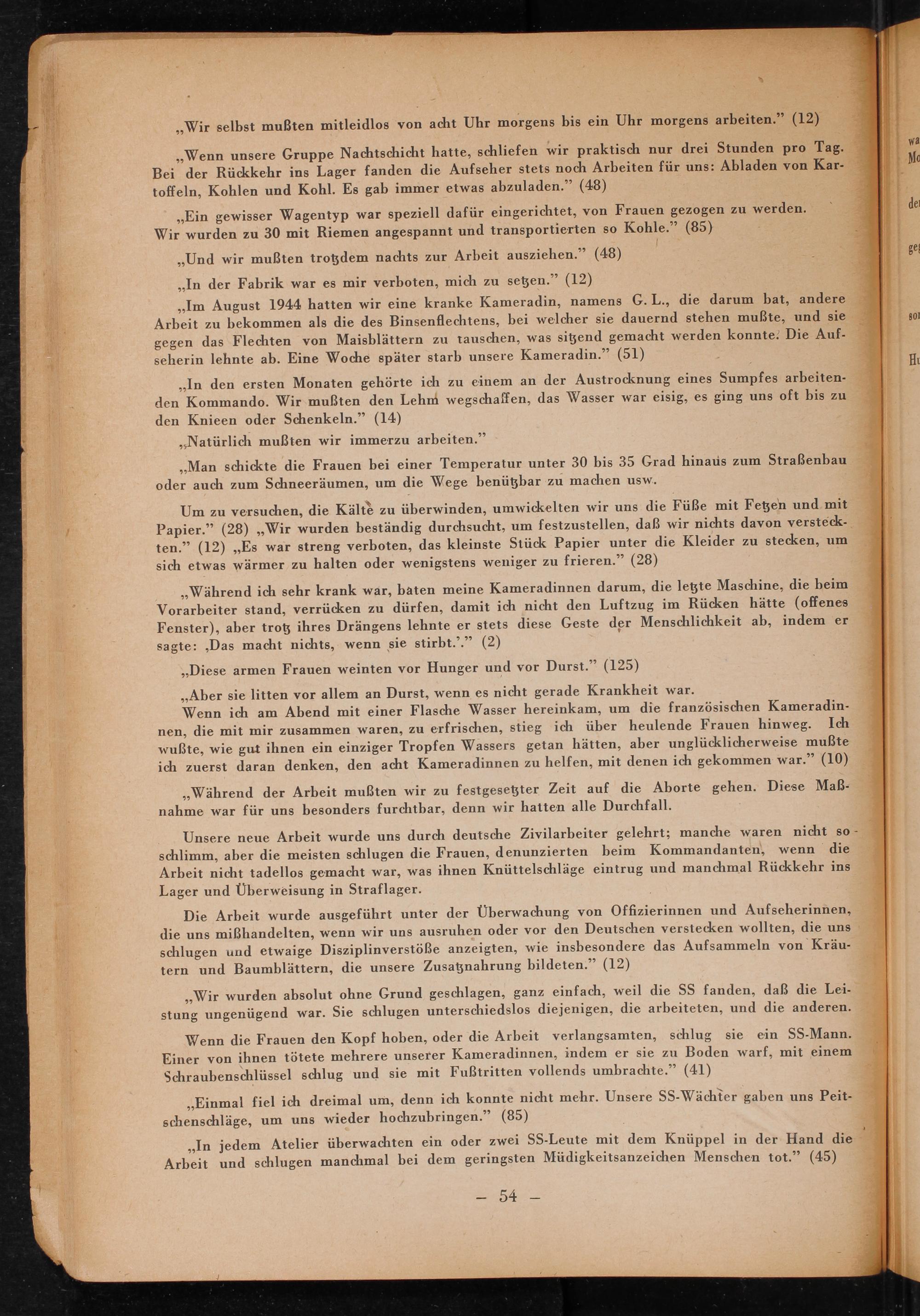 Wenn die Frauen den Kopf hoben, oder die Arbeit verlangsamten, schlug sie ein SS- Mann. Einer von ihnen tötete mehrere unserer Kameradinnen, indem er sie zu Boden warf, mit einem Schraubenschlüssel schlug und sie mit Fußtritten vollends umbrachte."( 41)