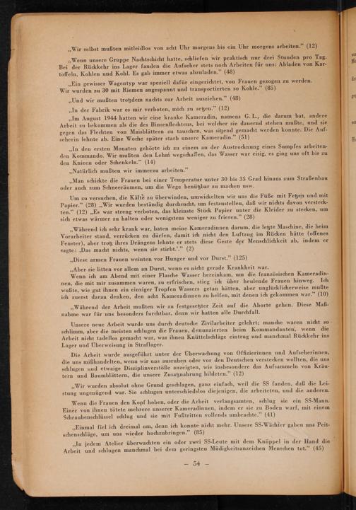Die Arbeit wurde ausgeführt unter der Überwachung von Offizierinnen und Aufseherinnen, die uns mißhandelten, wenn wir uns ausruhen oder vor den Deutschen verstecken wollten, die uns schlugen und etwaige Disziplinverstöße anzeigten, wie insbesondere das Aufsammeln von Kräutern und Baumblättern, die unsere Zusatznahrung bildeten."( 12)