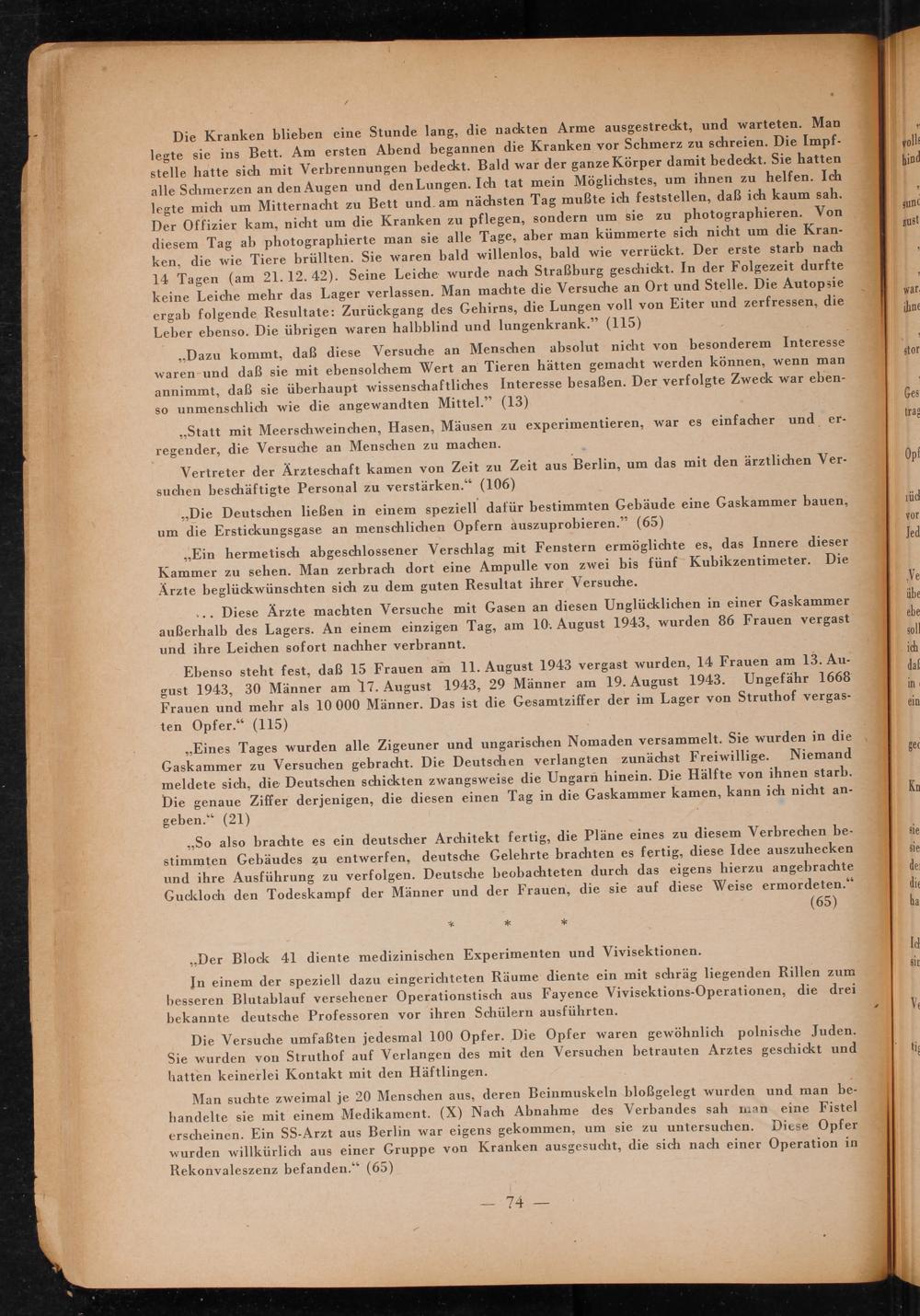 Die Kranken blieben eine Stunde lang, die nackten Arme ausgestreckt, und warteten. Man legte sie ins Bett. Am ersten Abend begannen die Kranken vor Schmerz zu schreien. Die Impfstelle hatte sich mit Verbrennungen bedeckt. Bald war der ganze Körper damit bedeckt. Sie hatten alle Schmerzen an den Augen und den Lungen. Ich tat mein Möglichstes, um ihnen zu helfen. Ich legte mich um Mitternacht zu Bett und am nächsten Tag mußte ich feststellen, daß ich kaum sah. Der Offizier kam, nicht um die Kranken zu pflegen, sondern um sie zu photographieren. Von diesem Tag ab photographierte man sie alle Tage, aber man kümmerte sich nicht um die Kranken, die wie Tiere brüllten. Sie waren bald willenlos, bald wie verrückt. Der erste starb nach 14 Tagen( am 21. 12. 42). Seine Leiche wurde nach Straßburg geschickt. In der Folgezeit durfte keine Leiche mehr das Lager verlassen. Man machte die Versuche an Ort und Stelle. Die Autopsie ergab folgende Resultate: Zurückgang des Gehirns, die Lungen voll von Eiter und zerfressen, die Leber ebenso. Die übrigen waren halbblind und lungenkrank."( 115)