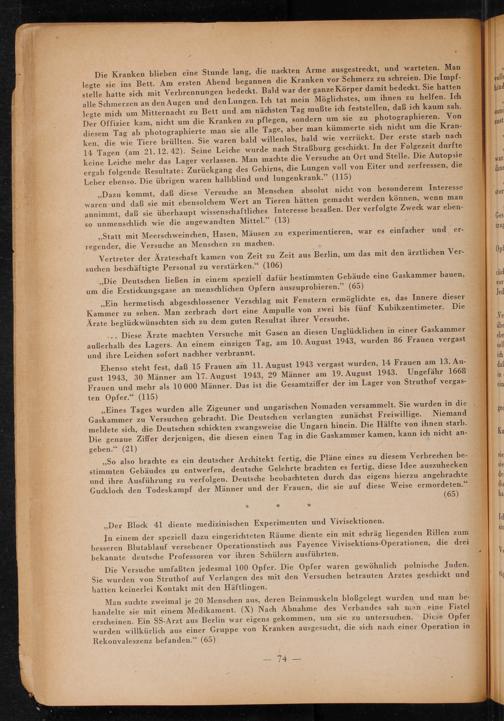 ,, So also brachte es ein deutscher Architekt fertig, die Pläne eines zu diesem Verbrechen bestimmten Gebäudes zu entwerfen, deutsche Gelehrte brachten es fertig, diese Idee auszuhecken und ihre Ausführung zu verfolgen. Deutsche beobachteten durch das eigens hierzu angebrachte Guckloch den Todeskampf der Männer und der Frauen, die sie auf diese Weise ermordeten." ( 65)