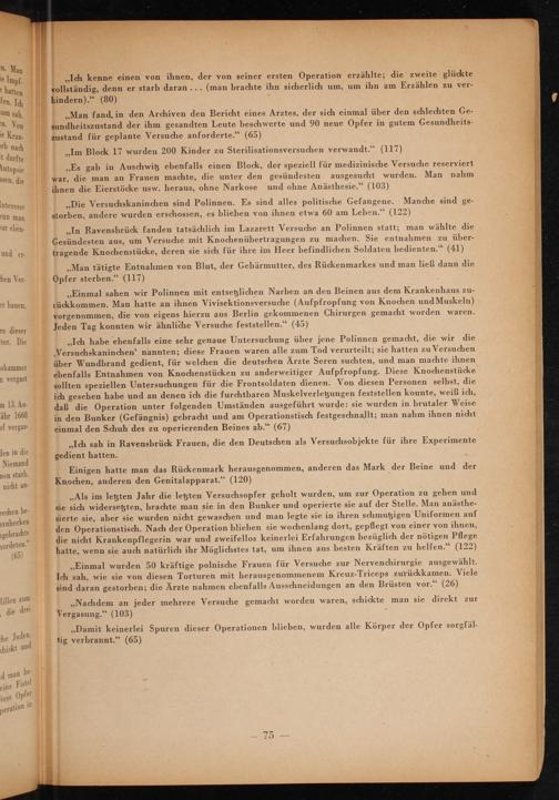 ,, Als im letzten Jahr die letzten Versuchsopfer geholt wurden, um zur Operation zu gehen und sie sich widersetzten, brachte man sie in den Bunker und operierte sie auf der Stelle. Man anästhesierte sie, aber sie wurden nicht gewaschen und man legte sie in ihren schmutzigen Uniformen auf den Operationstisch. Nach der Operation blieben sie wochenlang dort, gepflegt von einer von ihnen, die nicht Krankenpflegerin war und zweifellos keinerlei Erfahrungen bezüglich der nötigen Pflege hatte, wenn sie auch natürlich ihr Möglichstes tat, um ihnen aus besten Kräften zu helfen."( 122) ,, Einmal wurden 50 kräftige polnische Frauen für Versuche zur Nervenchirurgie ausgewählt. Ich sah, wie sie von diesen Torturen mit herausgenommenem Kreuz- Triceps zurückkamen. Viele sind daran gestorben; die Ärzte nahmen ebenfalls Ausschneidungen an den Brüsten vor."( 26)