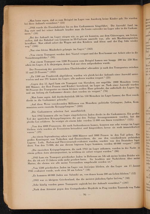 ,, An einem Septembertag sahen wir 5000 Männer und 3000 Frauen in den Tod gehen. großes Kontingent von Tschechen und Österreichern, die aus den verschiedenen polnischen Lagern: Lodz, Radom und Theresienstadt evakuiert wurden, wurden von den Deutschen liquidiert. Von den 75 000, die aus diesem letzteren Lager kommen, werden 60 000 vergast."( 102) ,, Die russischen Kriegsgefangenen, die nach 1943 im Lager ankamen, wurden in der Nacht in einem gelben Auto abtransportiert, in welchem sie sofort vergast wurden."( 86)