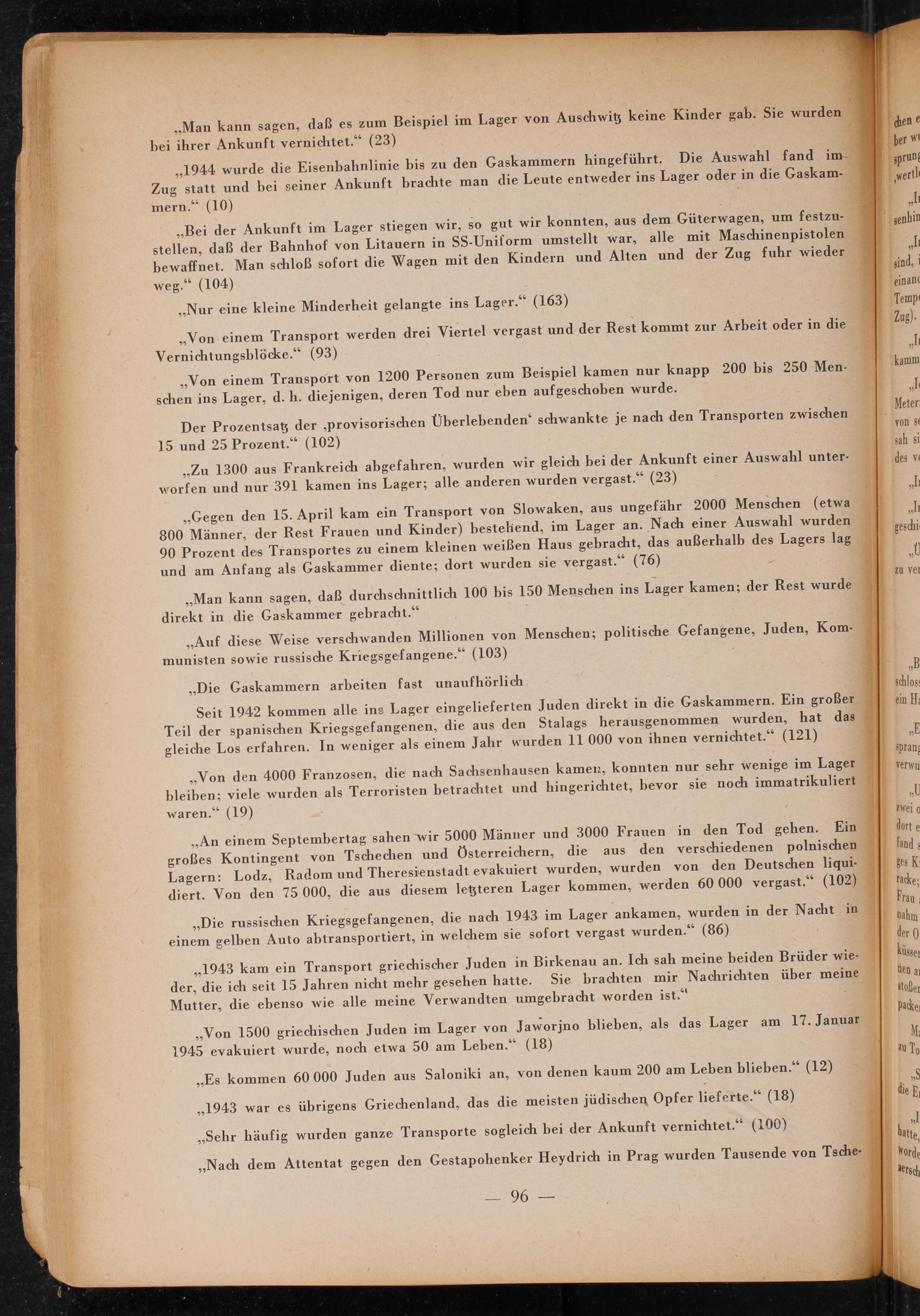 ,, Es kommen 60 000 Juden aus Saloniki an, von denen kaum 200 am Leben blieben."( 12) ,, 1943 war es übrigens Griechenland , das die meisten jüdischen Opfer lieferte."( 18) ,, Sehr häufig wurden ganze Transporte sogleich bei der Ankunft vernichtet."( 100) ,, Nach dem Attentat gegen den Gestapohenker Heydrich in Prag wurden Tausende von Tsche