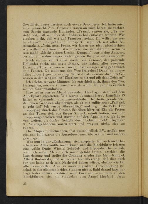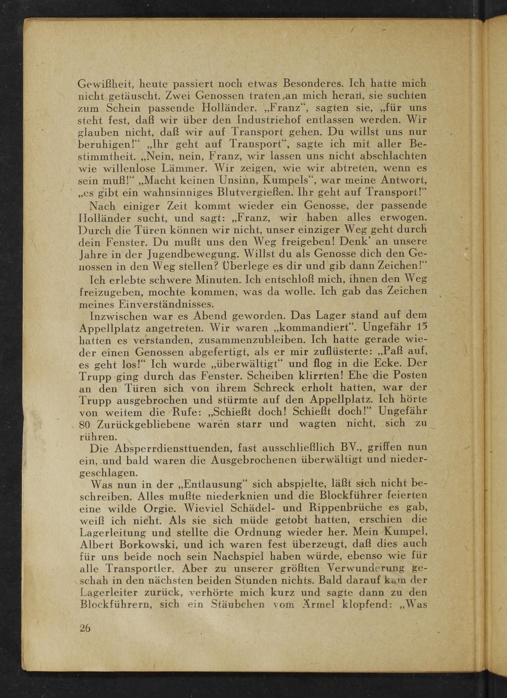 Inzwischen war es Abend geworden. Das Lager stand auf dem Appellplatz angetreten. Wir waren ,, kommandiert". Ungefähr 15 hatten es verstanden, zusammenzubleiben. Ich hatte gerade wieder einen Genossen abgefertigt, als er mir zuflüsterte: ,, Paß auf, es geht los!" Ich wurde ,, überwältigt" und flog in die Ecke. Der Trupp ging durch das Fenster. Scheiben klirrten! Ehe die Posten an den Türen sich von ihrem Schreck erholt hatten, war der Trupp ausgebrochen und stürmte auf den Appellplatz. Ich hörte von weitem die Rufe: ,, Schießt doch! Schießt doch!" Ungefähr 80 Zurückgebliebene waren starr und wagten nicht, sich zu rühren.