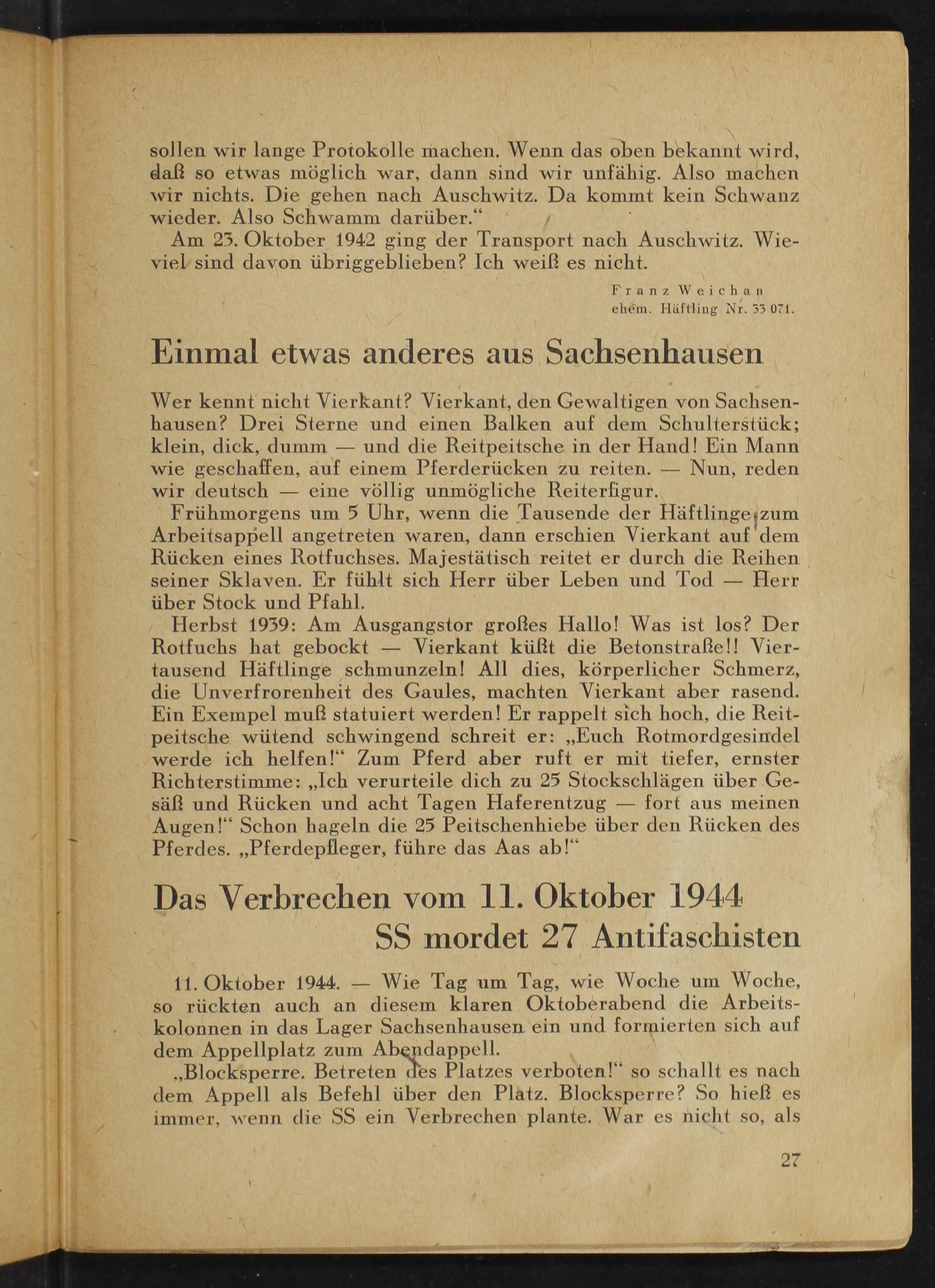 Herbst 1939: Am Ausgangstor großes Hallo! Was ist los? Der Rotfuchs hat gebockt- Vierkant küßt die Betonstraẞe!! Viertausend Häftlinge schmunzeln! All dies, körperlicher Schmerz, die Unverfrorenheit des Gaules, machten Vierkant aber rasend. Ein Exempel muß statuiert werden! Er rappelt sich hoch, die Reitpeitsche wütend schwingend schreit er:„, Euch Rotmordgesindel werde ich helfen!" Zum Pferd aber ruft er mit tiefer, ernster Richterstimme: ,, Ich verurteile dich zu 25 Stockschlägen über Gesäß und Rücken und acht Tagen Haferentzug fort aus meinen Augen!" Schon hageln die 25 Peitschenhiebe über den Rücken des Pferdes. ,, Pferdepfleger, führe das Aas ab!"