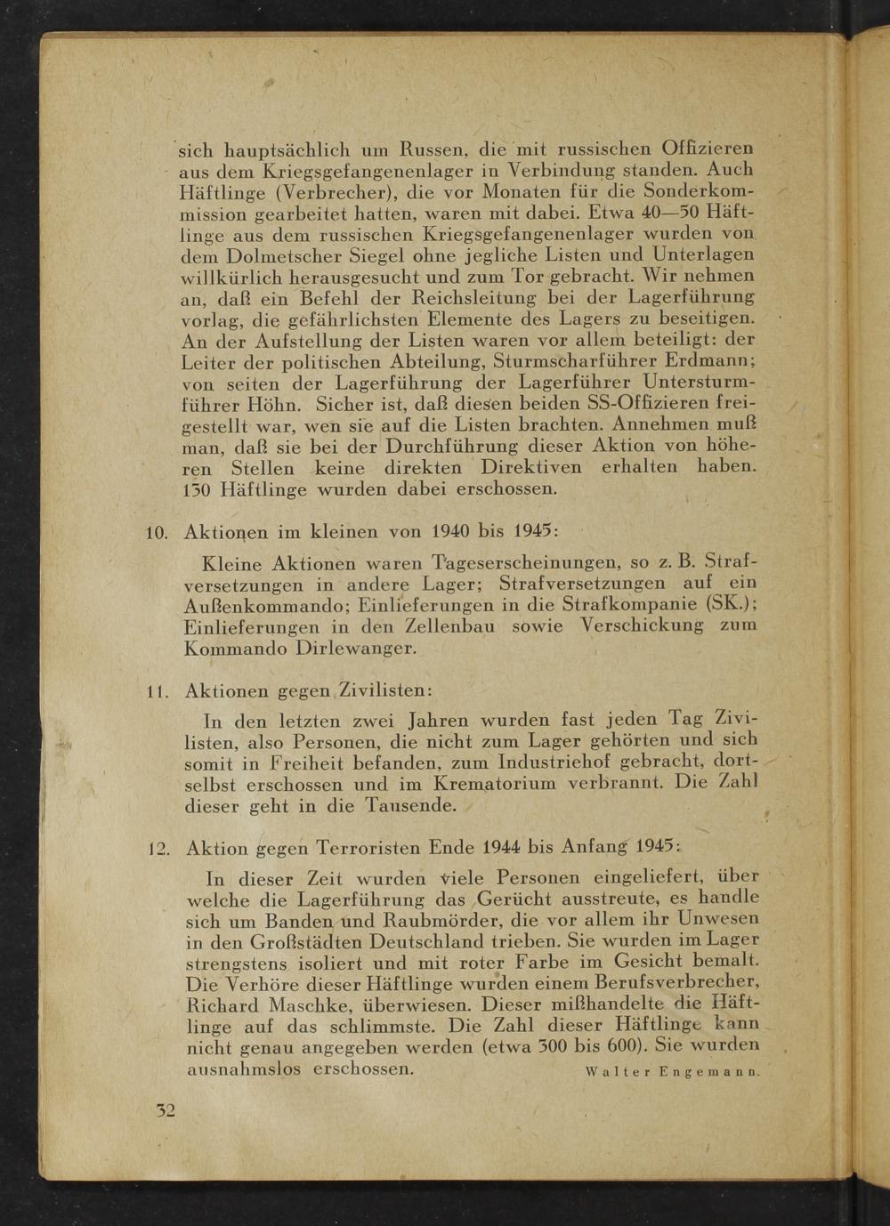 sich hauptsächlich um Russen, die mit russischen Offizieren aus dem Kriegsgefangenenlager in Verbindung standen. Auch Häftlinge( Verbrecher), die vor Monaten für die Sonderkommission gearbeitet hatten, waren mit dabei. Etwa 40-50 Häftlinge aus dem russischen Kriegsgefangenenlager wurden von. dem Dolmetscher Siegel ohne jegliche Listen und Unterlagen willkürlich herausgesucht und zum Tor gebracht. Wir nehmen an, daß ein Befehl der Reichsleitung bei der Lagerführung vorlag, die gefährlichsten Elemente des Lagers zu beseitigen. An der Aufstellung der Listen waren vor allem beteiligt: der Leiter der politischen Abteilung, Sturmscharführer Erdmann; von seiten der Lagerführung der Lagerführer Untersturmführer Höhn. Sicher ist, daß diesen beiden SS - Offizieren freigestellt war, wen sie auf die Listen brachten. Annehmen muß man, daß sie bei der Durchführung dieser Aktion von höheren Stellen keine direkten Direktiven erhalten haben. 150 Häftlinge wurden dabei erschossen.