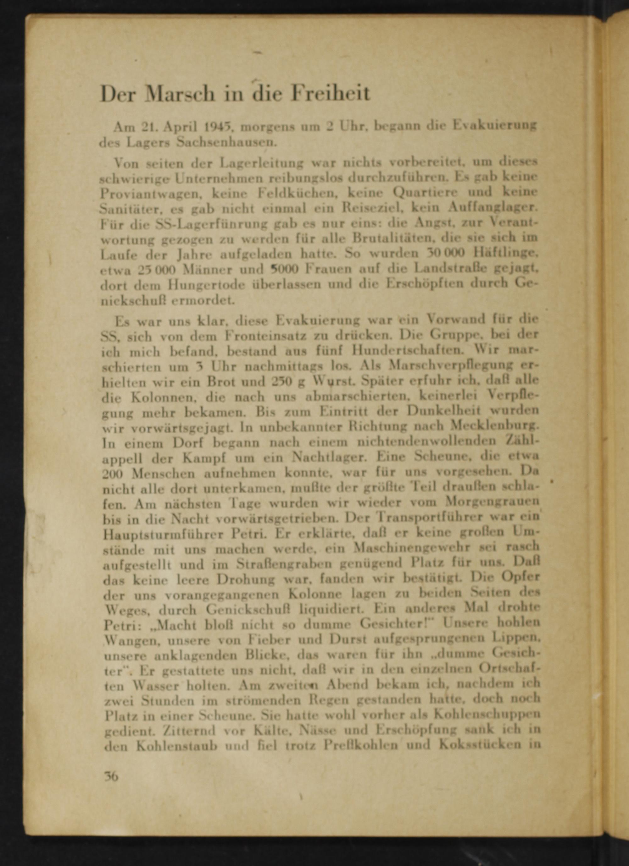 Es war uns klar, diese Evakuierung war ein Vorwand für die SS, sich von dem Fronteinsatz zu drücken. Die Gruppe, bei der ich mich befand, bestand aus fünf Hundertschaften. Wir marschierten um 3 Uhr nachmittags los. Als Marschverpflegung erhielten wir ein Brot und 250 g Wurst. Später erfuhr ich, daß alle die Kolonnen, die nach uns abmarschierten, keinerlei Verpflegung mehr bekamen. Bis zum Eintritt der Dunkelheit wurden wir vorwärtsgejagt. In unbekannter Richtung nach Mecklenburg . In einem Dorf begann nach einem nichtendenwollenden Zählappell der Kampf um ein Nachtlager. Eine Scheune, die etwa 200 Menschen aufnehmen konnte, war für uns vorgesehen. Da nicht alle dort unterkamen, mußte der größte Teil drauflen schlafen. Am nächsten Tage wurden wir wieder vom Morgengrauen bis in die Nacht vorwärtsgetrieben. Der Transportführer war ein Hauptsturmführer Petri. Er erklärte, daß er keine großlen Umstände mit uns machen werde, ein Maschinengewehr sei rasch aufgestellt und im Straßengraben genügend Platz für uns. Daß das keine leere Drohung war, fanden wir bestätigt. Die Opfer der uns vorangegangenen Kolonne lagen zu beiden Seiten des Weges, durch Genickschuß liquidiert. Ein anderes Mal drohte Petri:„ Macht bloß nicht so dumme Gesichter!" Unsere hohlen Wangen, unsere von Fieber und Durst aufgesprungenen Lippen, unsere anklagenden Blicke, das waren für ihn..dumme Gesichter". Er gestattete uns nicht, daß wir in den einzelnen Ortschaften Wasser holten. Am zweiten Abend bekam ich, nachdem ich zwei Stunden im strömenden Regen gestanden hatte, doch noch Platz in einer Scheune. Sie hatte wohl vorher als Kohlenschuppen gedient. Zitternd vor Kälte, Nässe und Erschöpfung sank ich in den Kohlenstaub und fiel trotz Prefkohlen und Koksstücken in