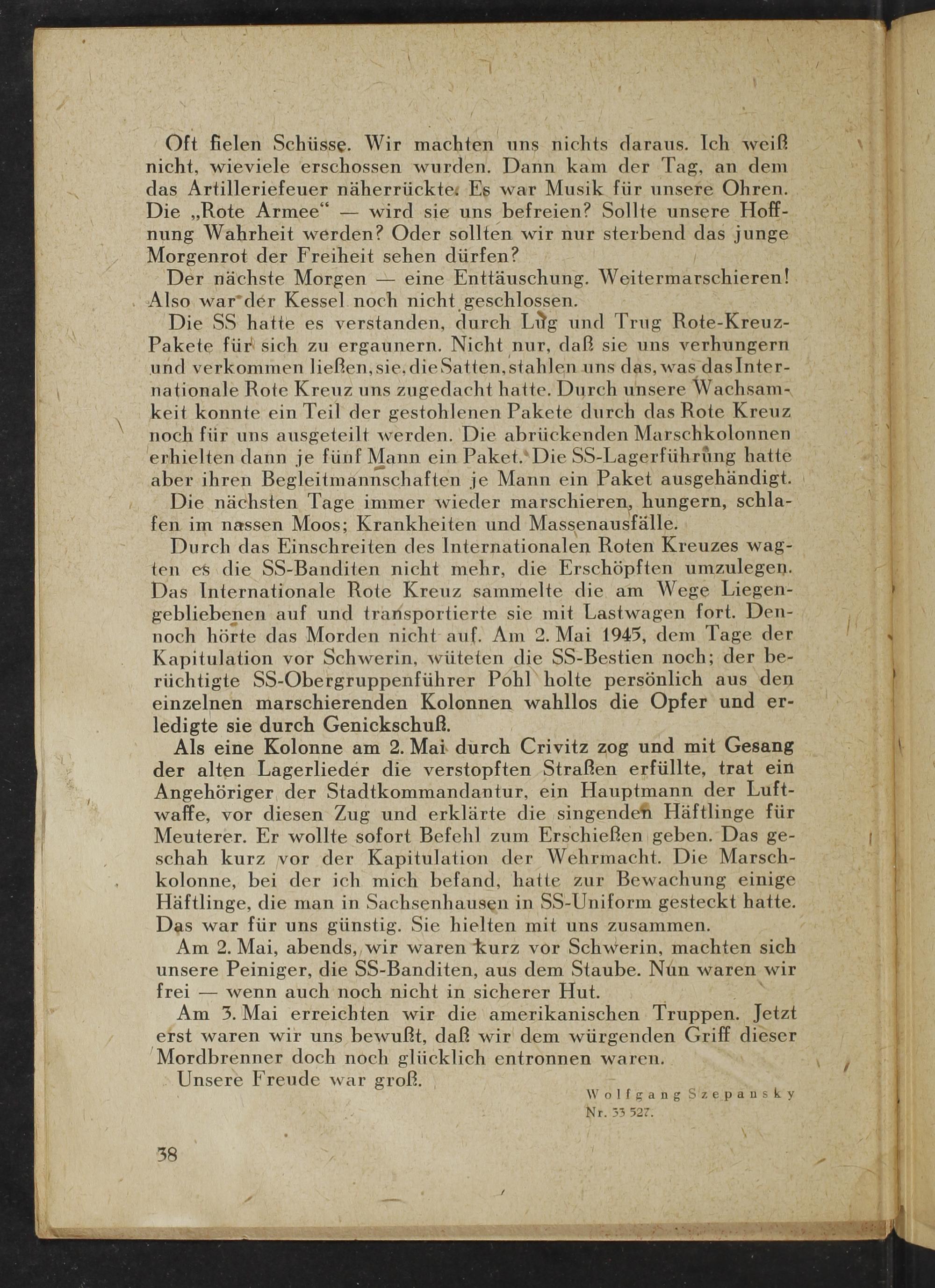 Durch das Einschreiten des Internationalen Roten Kreuzes wagten es die SS - Banditen nicht mehr, die Erschöpften umzulegen. Das Internationale Rote Kreuz sammelte die am Wege Liegengebliebenen auf und transportierte sie mit Lastwagen fort. Dennoch hörte das Morden nicht auf. Am 2. Mai 1945, dem Tage der Kapitulation vor Schwerin, wüteten die SS - Bestien noch; der berüchtigte SS- Obergruppenführer Pohl holte persönlich aus den einzelnen marschierenden Kolonnen wahllos die Opfer und erledigte sie durch Genickschuß.