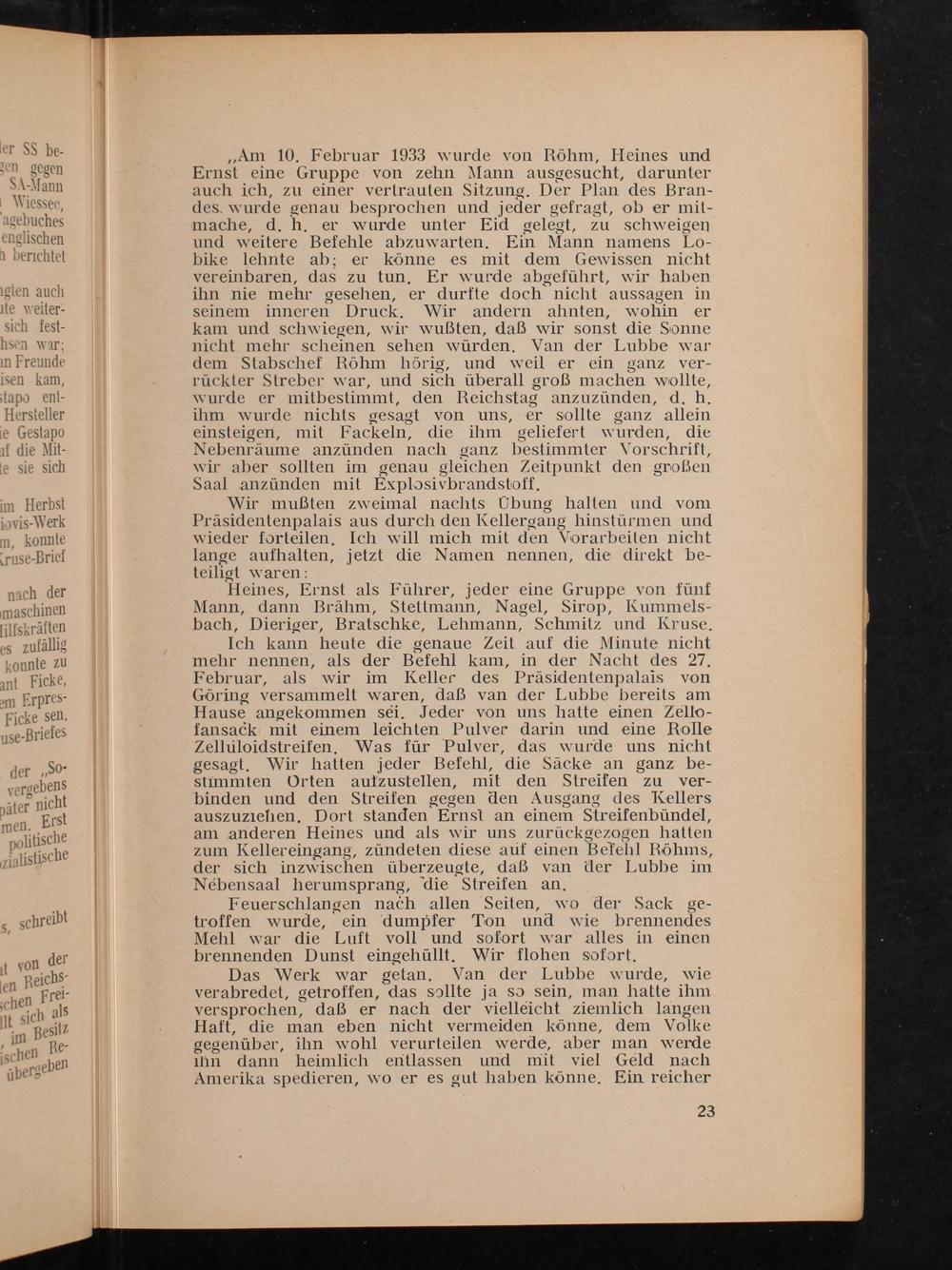 ,, Am 10. Februar 1933 wurde von Röhm, Heines und Ernst eine Gruppe von zehn Mann ausgesucht, darunter auch ich, zu einer vertrauten Sitzung. Der Plan des Brandes. wurde genau besprochen und jeder gefragt, ob er mitmache, d. h. er wurde unter Eid gelegt, zu schweigen und weitere Befehle abzuwarten. Ein Mann namens Lobike lehnte ab; er könne es mit dem Gewissen nicht vereinbaren, das zu tun. Er wurde abgeführt, wir haben ihn nie mehr gesehen, er durfte doch nicht aussagen in seinem inneren Druck. Wir andern ahnten, wohin kam und schwiegen, wir wußten, daß wir sonst die Sonne nicht mehr scheinen sehen würden. Van der Lubbe war dem Stabschef Röhm hörig, und weil er ein ganz verrückter Streber war, und sich überall groß machen wollte, wurde er mitbestimmt, den Reichstag anzuzünden, d. h. ihm wurde nichts gesagt von uns, er sollte ganz allein einsteigen, mit Fackeln, die ihm geliefert wurden, die Nebenräume anzünden nach ganz bestimmter Vorschrift, wir aber sollten im genau gleichen Zeitpunkt den großen Saal anzünden mit Explosivbrandstoff.