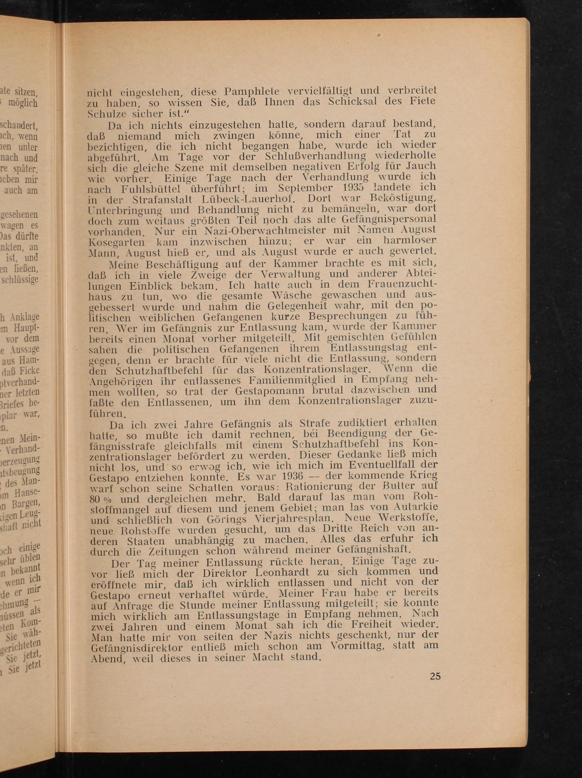 Da ich nichts einzugestehen hatte, sondern darauf bestand, daß niemand mich zwingen könne, mich einer Tat bezichtigen, die ich nicht begangen habe, wurde ich wieder abgeführt. Am Tage vor der Schlußverhandlung wiederholte sich die gleiche Szene mit demselben negativen Erfolg für Jauch wie vorher. Einige Tage nach der Verhandlung wurde ich nach Fuhlsbüttel überführt; im September 1935 landete ich in der Strafanstalt Lübeck- Lauerhof. Dort war Beköstigung, Unterbringung und Behandlung nicht zu bemängeln, war dort doch zum weitaus größten Teil noch das alte Gefängnispersonal vorhanden. Nur ein Nazi- Oberwachtmeister mit Namen August Kosegarten kam inzwischen hinzu; harmloser war ein Mann, August hieß er, und als August wurde er auch gewertet. Meine Beschäftigung auf der Kammer brachte es mit sich, daß ich in viele Zweige der Verwaltung und anderer Abteilungen Einblick bekam. Ich hatte auch in dem Frauenzuchthaus zu tun, wo die gesamte Wäsche gewaschen und ausgebessert wurde und nahm die Gelegenheit wahr, mit den politischen weiblichen Gefangenen kurze Besprechungen zu führen. Wer im Gefängnis zur Entlassung kam, wurde der Kammer bereits einen Monat vorher mitgeteilt. Mit gemischten Gefühlen sahen die politischen Gefangenen ihrem Entlassungstag entgegen, denn er brachte für viele nicht die Entlassung, sondern Wenn die den Schutzhaftbefehl für das Konzentrationslager. Angehörigen ihr entlassenes Familienmitglied in Empfang nehmen wollten, so trat der Gestapomann brutal dazwischen und faẞte den Entlassenen, um ihn dem Konzentrationslager zuzuführen.