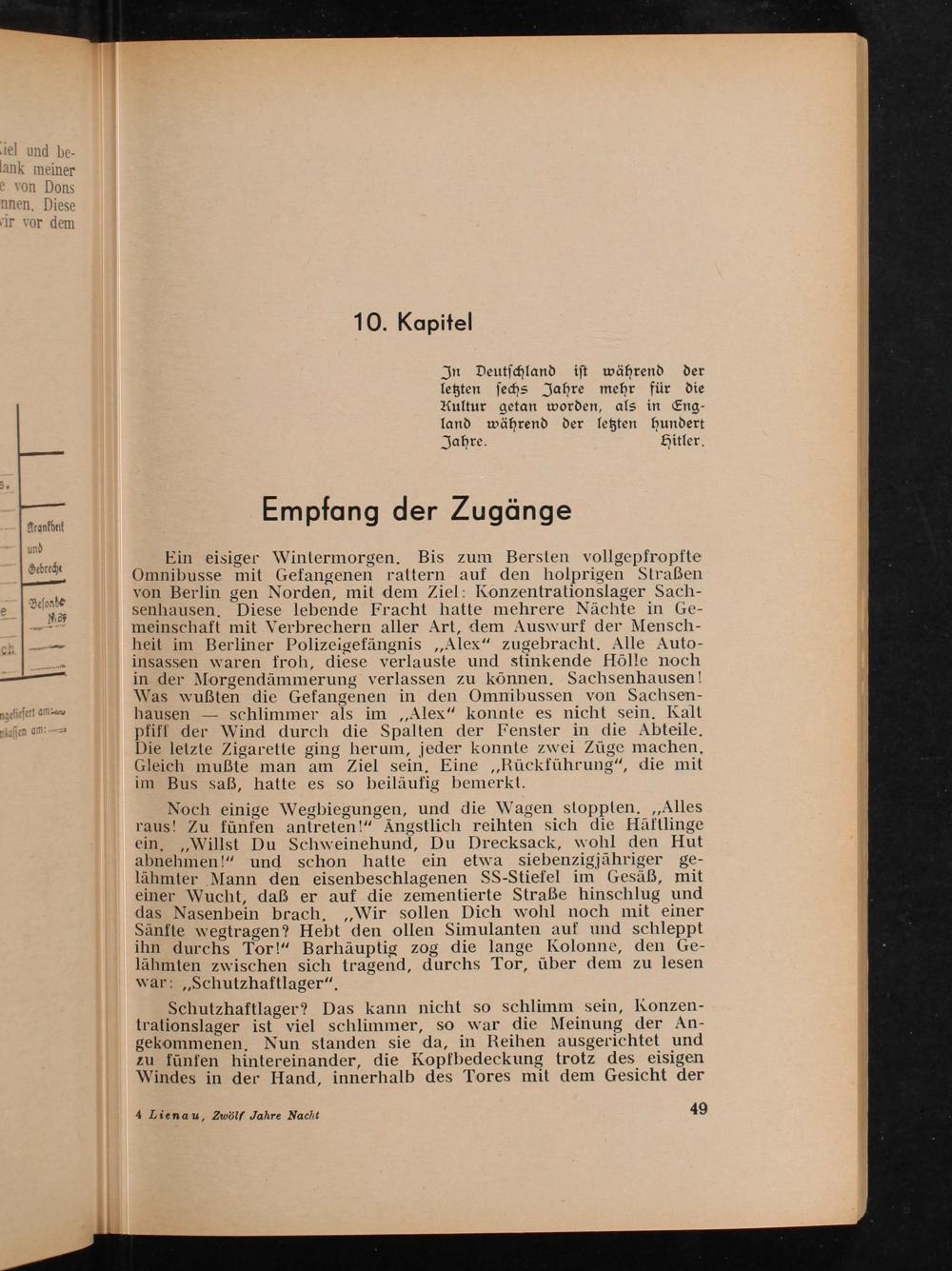 Ein eisiger Wintermorgen. Bis zum Bersten vollgepfropfte Omnibusse mit Gefangenen rattern auf den holprigen Straßen von Berlin gen Norden, mit dem Ziel: Konzentrationslager Sachsenhausen. Diese lebende Fracht hatte mehrere Nächte in Gemeinschaft mit Verbrechern aller Art, dem Auswurf der Menschheit im Berliner Polizeigefängnis ,, Alex" zugebracht. Alle Autoinsassen waren froh, diese verlauste und stinkende Hölle noch in der Morgendämmerung verlassen zu können. Sachsenhausen! Was wußten die Gefangenen in den Omnibussen von Sachsenhausen schlimmer als im ,, Alex" konnte es nicht sein. Kalt pfiff der Wind durch die Spalten der Fenster in die Abteile. Die letzte Zigarette ging herum, jeder konnte zwei Züge machen. Gleich mußte man am Ziel sein. Eine ,, Rückführung", die mit im Bus saẞ, hatte es so beiläufig bemerkt.