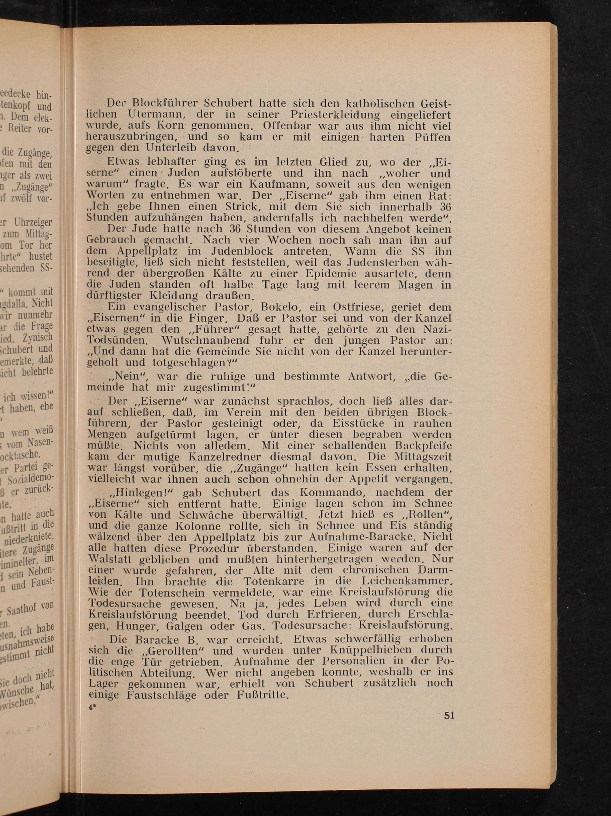 Etwas lebhafter ging es im letzten Glied zu, wo der ,, Eiserne " einen Juden aufstöberte und ihn nach ,, woher und warum" fragte. Es war ein Kaufmann, soweit aus den wenigen Worten zu entnehmen war. Der Eiserne " gab ihm einen Rat: ,, Ich gebe Ihnen einen Strick, mit dem Sie sich innerhalb 36 Stunden aufzuhängen haben, andernfalls ich nachhelfen werde". Der Jude hatte nach 36 Stunden von diesem Angebot keinen Gebrauch gemacht. Nach vier Wochen noch sah man ihn auf dem Appellplatz im Judenblock antreten. Wann die SS ihn beseitigte, ließ sich nicht feststellen, weil das Judensterben während der übergroßen Kälte zu einer Epidemie ausartete, denn die Juden standen oft halbe Tage lang mit leerem Magen in dürftigster Kleidung draußen.