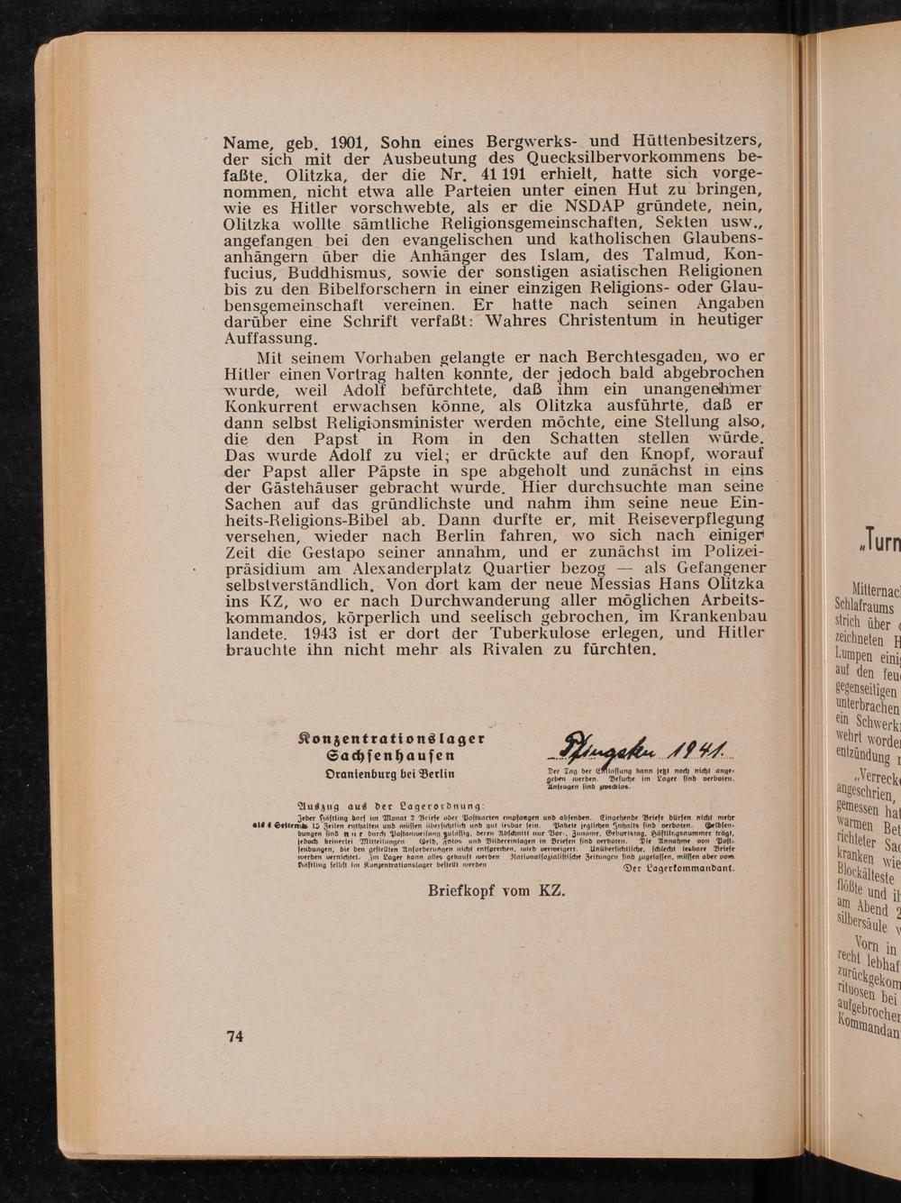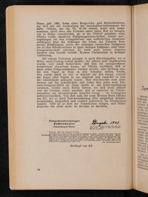 Name, geb. 1901, Sohn eines Bergwerks- und Hüttenbesitzers, der sich mit der Ausbeutung des Quecksilbervorkommens befaßte. Olitzka, der die Nr. 41 191 erhielt, hatte sich vorgenommen, nicht etwa alle Parteien unter einen Hut zu bringen, wie es Hitler vorschwebte, als er die NSDAP gründete, nein, Olitzka wollte sämtliche Religionsgemeinschaften, Sekten usw., angefangen bei den evangelischen und katholischen Glaubensanhängern über die Anhänger des Islam, des Talmud, Konfucius, Buddhismus , sowie der sonstigen asiatischen Religionen bis zu den Bibelforschern in einer einzigen Religions- oder Glaubensgemeinschaft vereinen. Er hatte nach seinen Angaben darüber eine Schrift verfaßt: Wahres Christentum in heutiger Auffassung.