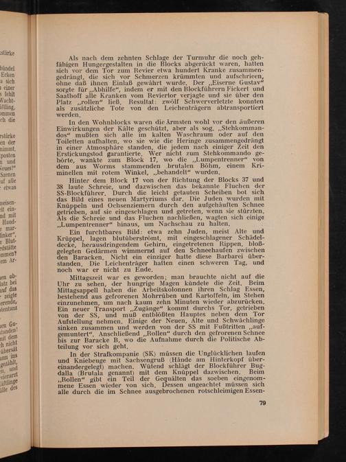 In den Wohnblocks waren die Ärmsten wohl vor den äußeren Einwirkungen der Kälte geschützt, aber als sog. ,, Stehkommandos" mußten sich alle im kalten Waschraum oder auf den Toiletten aufhalten, wo sie wie die Heringe zusammengedrängt in einer Atmosphäre standen, die jedem nach einiger Zeit den Erstickungstod garantierte. Wer nicht zum Stehkommando gehörte, wankte zum Block 17, wo die ,, Lumpentrenner" von dem aus Worms stammenden brutalen Böhm, einem Kriminellen mit rotem Winkel ,,, behandelt" wurden.