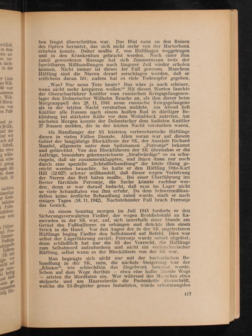 ben längst überschritten war. Das Blut rann an den Beinen des Opfers herunter, das sich nicht mehr von der Marterbank erheben konnte. Daher mußte Z. von Häftlingen weggetragen und in den Krankenbau gebracht werden. Nach einer ihm zuteil gewordenen Massage hat sich Zimmermann trotz der furchtbaren Mißhandlungen nach längerer Zeit wieder erholen können. Nicht immer ist dieses der Fall gewesen. Manchem Häftling sind die Nieren derart zerschlagen worden, daß er zeitlebens daran litt; zudem hat es viele Todesopfer gegeben. , Was? Nur neun Tote heute? Das wäre ja noch schöner, wenn nicht mehr krepieren wollen!" Mit diesen Worten fauchte der Oberscharführer Knittler vom russischen Kriegsgefangenenlager den Dolmetscher Wilhelm Beuche an, als ihm dieser beim Morgenappell des 28. 11, 1941 neun russische Kriegsgefangene als in der letzten Nacht verstorben meldete. Am Abend ließ Knittler alle Russen nach einem heißen Bad in dürftiger Bekleidung bei stärkster Kälte vor dem Wohnblock antreten. Am nächsten Morgen konnte der Dolmetscher dem Sadisten Knittler 37 Russen melden, die in der letzten Nacht verstorben waren.