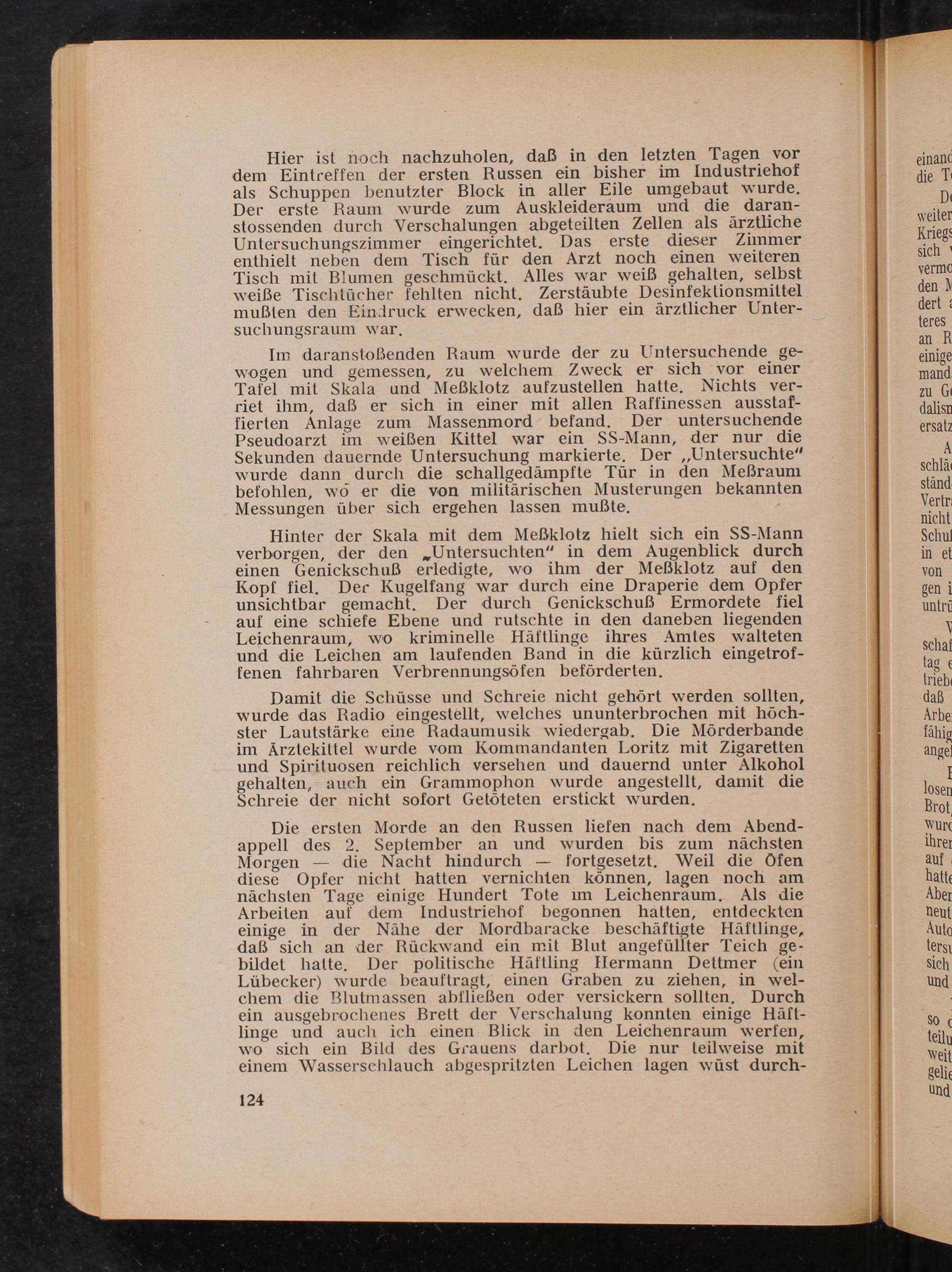 Die ersten Morde an den Russen liefen nach dem Abendappell des 2. September an und wurden bis zum nächsten Morgen die Nacht hindurch fortgesetzt. Weil die Öfen diese Opfer nicht hatten vernichten können, lagen noch am nächsten Tage einige Hundert Tote im Leichenraum. Als die Arbeiten auf dem Industriehof begonnen hatten, entdeckten einige in der Nähe der Mordbaracke beschäftigte Häftlinge, daß sich an der Rückwand ein mit Blut angefüllter Teich gebildet hatte. Der politische Häftling Hermann Dettmer( ein Lübecker) wurde beauftragt, einen Graben zu ziehen, in welchem die Blutmassen abfließen oder versickern sollten. Durch ein ausgebrochenes Brett der Verschalung konnten einige Häftlinge und auch ich einen Blick in den Leichenraum werfen, wo sich ein Bild des Grauens darbot. Die nur teilweise mit einem Wasserschlauch abgespritzten Leichen lagen wüst durch