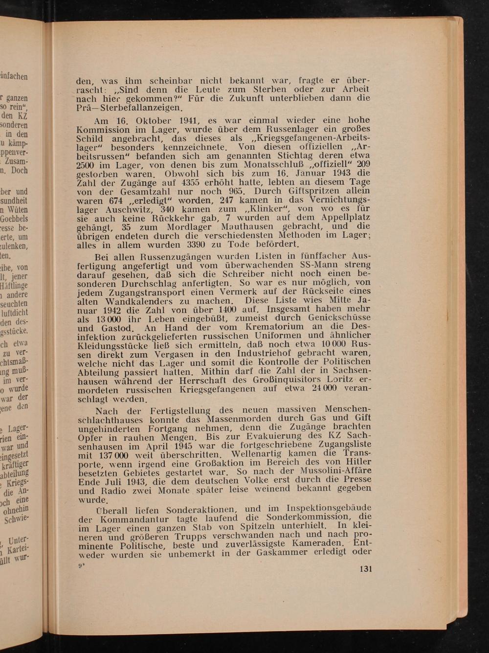 Am 16. Oktober 1941, es war einmal wieder eine hohe Kommission im Lager, wurde über dem Russenlager ein großes Schild angebracht, das dieses als ,, Kriegsgefangenen- Arbeitslager" besonders kennzeichnete. Von diesen offiziellen ,, Arbeitsrussen" befanden sich am genannten Stichtag deren etwa 2500 im Lager, von denen bis zum Monatsschluß ,, offiziell" 209 gestorben waren. Obwohl sich bis zum 16. Januar 1943 die Zahl der Zugänge auf 4355 erhöht hatte, lebten an diesem Tage von der Gesamtzahl nur noch 965. Durch Giftspritzen allein waren 674,, erledigt" worden, 247 kamen in das Vernichtungslager Auschwitz , 340 kamen zum ,, Klinker", von wo es für sie auch keine Rückkehr gab, 7 wurden auf dem Appellplatz gehängt, 35 zum Mordlager Mauthausen gebracht, und die übrigen endeten durch die verschiedensten Methoden im Lager; alles in allem wurden 3390 zu Tode befördert.