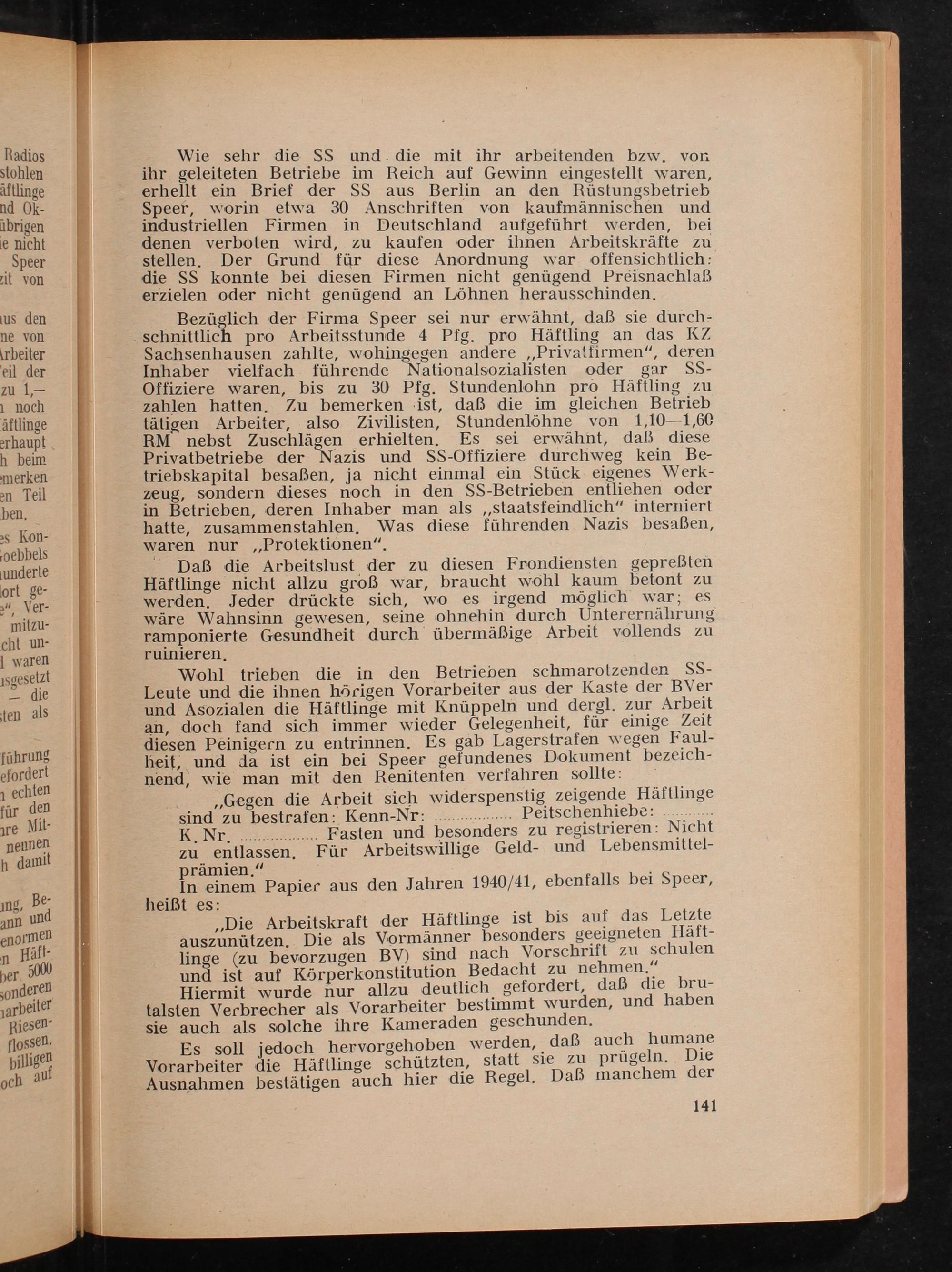 Bezüglich der Firma Speer sei nur erwähnt, daß sie durchschnittlich pro Arbeitsstunde 4 Pfg. pro Häftling an das KZ Sachsenhausen zahlte, wohingegen andere ,, Privatfirmen", deren Inhaber vielfach führende Nationalsozialisten oder gar SSOffiziere waren, bis zu 30 Pfg. Stundenlohn pro Häftling zu zahlen hatten. Zu bemerken ist, daß die im gleichen Betrieb tätigen Arbeiter, also Zivilisten, Stundenlöhne von 1,10-1,60 RM nebst Zuschlägen erhielten. Es sei erwähnt, daß diese Privatbetriebe der Nazis und SS - Offiziere durchweg kein Betriebskapital besaßen, ja nicht einmal ein Stück eigenes Werkzeug, sondern dieses noch in den SS - Betrieben entliehen oder in Betrieben, deren Inhaber man als ,, staatsfeindlich" interniert hatte, zusammenstahlen. Was diese führenden Nazis besaßen, waren nur ,, Protektionen".